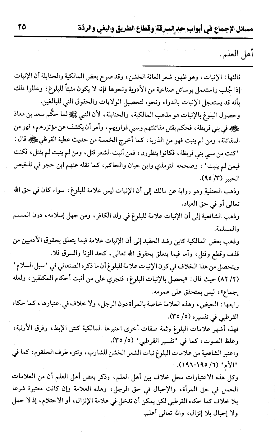 وذهب بعض المالكية كابن رشد الحفيد إلى أن الإنبات علامة فيما يتعلق بحقوق الآدميين من قذف وقطع وقتل، وأما فيما يتعلق بحقوق اللَّه تعالى، كحد الزنا والسرق فلا.