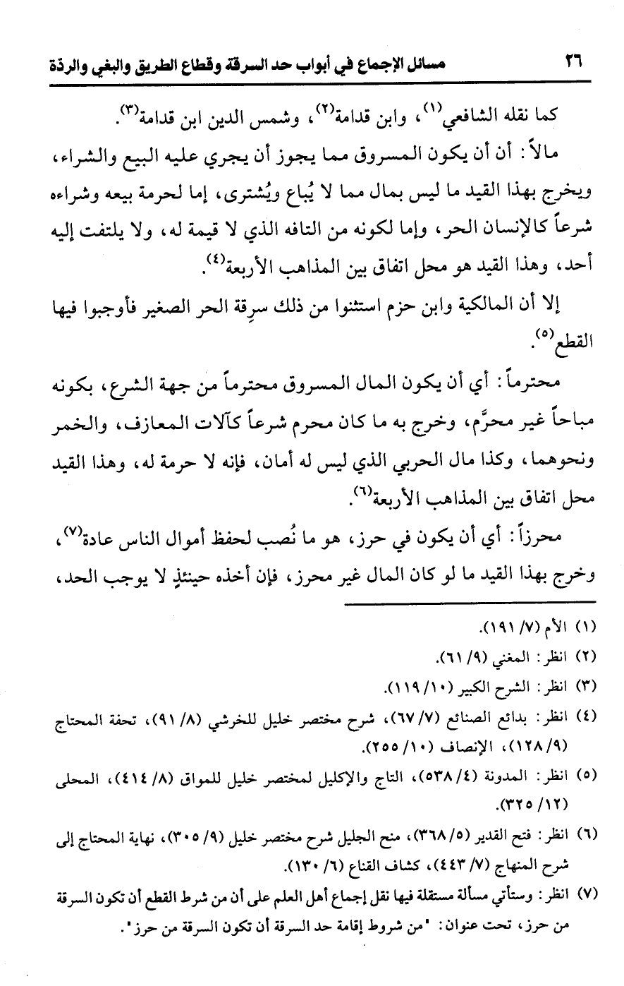 (¬7) انظر: وستأتي مسألة مستقلة فيها نقل إجماع أهل العلم على أن من شرط القطع أن تكون السرقة من حرز، تحت عنوان: "من شروط إقامة حد السرقة أن تكون السرقة من حرز".