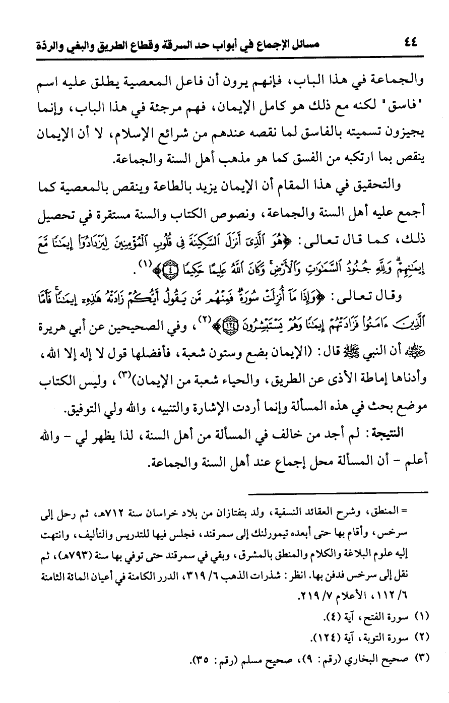 وقال تعالى: {وَإِذَا مَا أُنْزِلَتْ سُورَةٌ فَمِنْهُمْ مَنْ يَقُولُ أَيُّكُمْ زَادَتْهُ هَذِهِ إِيمَانًا فَأَمَّا الَّذِينَ آمَنُوا فَزَادَتْهُمْ إِيمَانًا وَهُمْ يَسْتَبْشِرُونَ (124)} (¬2)، وفي الصحيحين عن أبي هريرة -رضي اللَّه عنه- أن النبي -صلى اللَّه عليه وسلم- قال: (الإيمان بضع وستون شعبة، فأفضلها قول لا إله إلا اللَّه، وأدناها إماطة الأذى عن الطريق، والحياء شعبة من الإيمان) (¬3)، وليس الكتاب موضع بحث في هذه المسألة وإنما أردت الإشارة والتنبيه، واللَّه ولي التوفيق.Rلم أجد من خالف في المسألة من أهل السنة، لذا يظهر لي -واللَّه أعلم- أن المسألة محل إجماع عند أهل السنة والجماعة.