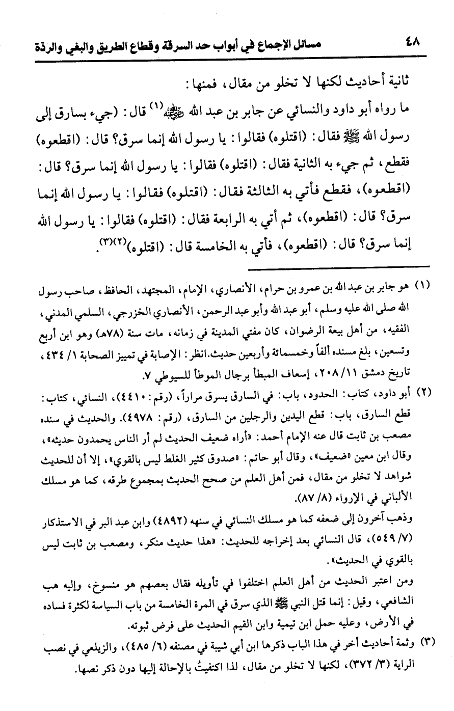 (¬2) أبو داود، كتاب: الحدود، باب: في السارق يسرق مرارًا، (رقم: 4410)، النسائي، كتاب: قطع السارق، باب: قطع اليدين والرجلين من السارق، (رقم: 4978). والحديث في سنده مصعب بن ثابت قال عنه الإمام أحمد: "أراه ضعيف الحديث لم أر الناس يحمدون حديثه"، وقال ابن معين "ضعيف"، وقال أبو حاتم: "صدوق كثير الغلط ليس بالقوي"، إلا أن للحديث شواهد لا تخلو من مقال، فمن أهل العلم من صحح الحديث بمجموع طرقه، كما هو مسلك الألباني في الإرواء (8/ 87).