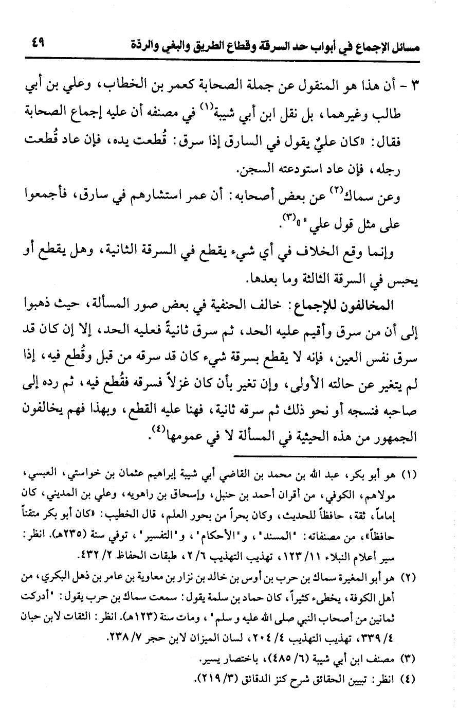 3 - أن هذا هو المنقول عن جملة الصحابة كعمر بن الخطاب، وعلي بن أبي طالب وغيرهما، بل نقل ابن أبي شيبة (¬1) في مصنفه أن عليه إجماع الصحابة فقال: "كان عليٌ يقول في السارق إذا سرق: قُطعت يده، فإن عاد قُطعت رجله، فإن عاد استودعته السجن.