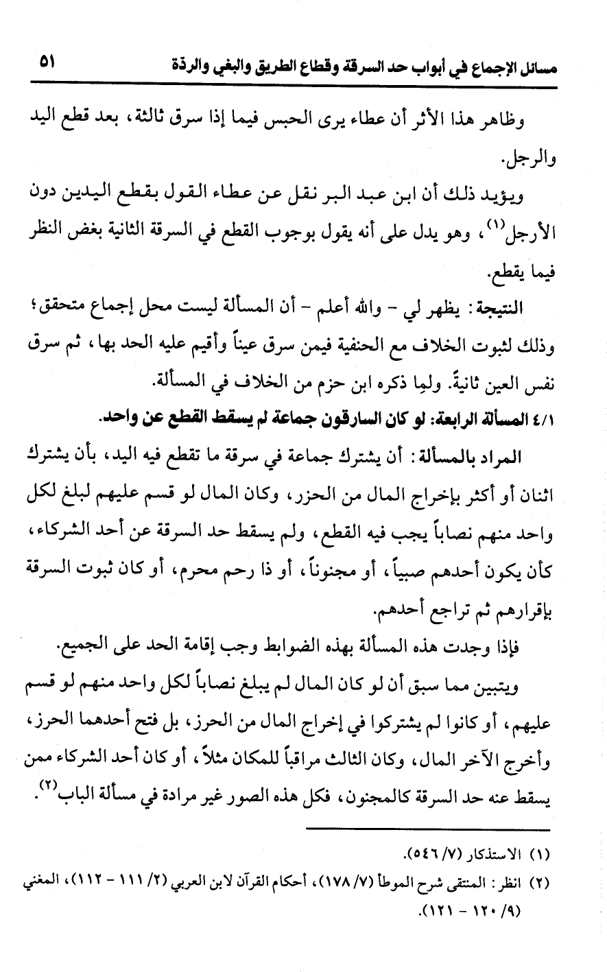ويؤيد ذلك أن ابن عبد البر نقل عن عطاء القول بقطع اليدين دون الأرجل (¬1)، وهو يدل على أنه يقول بوجوب القطع في السرقة الثانية بغض النظر فيما يقطع.Rيظهر لي -واللَّه أعلم- أن المسألة ليست محل إجماع متحقق؛ وذلك لثبوت الخلاف مع الحنفية فيمن سرق عينًا وأقيم عليه الحد بها، ثم سرق نفس العين ثانيةً. ولما ذكره ابن حزم من الخلاف في المسألة.