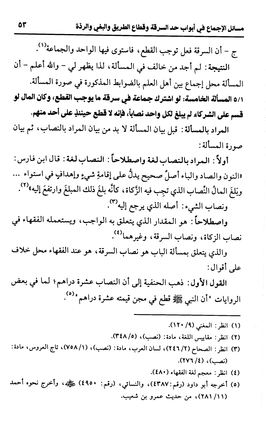 [5/ 1] المسألة الخامسة: لو اشترك جماعة في سرقة ما يوجب القطع، وكان المال لو قسم على الشركاء لم ييلغ لكل واحد نصابًا، فإنه لا قطع حيننذٍ على أحد منهم.
