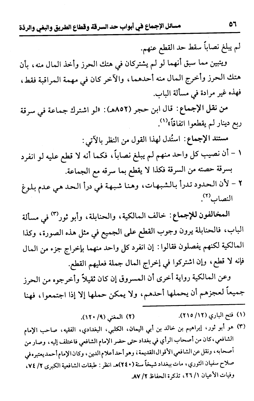 • من نقل الإجماع: قال ابن حجر (852 هـ): "لو اشترك جماعة في سرقة ربع دينار لم يقطعوا اتفاقًا" (¬1).