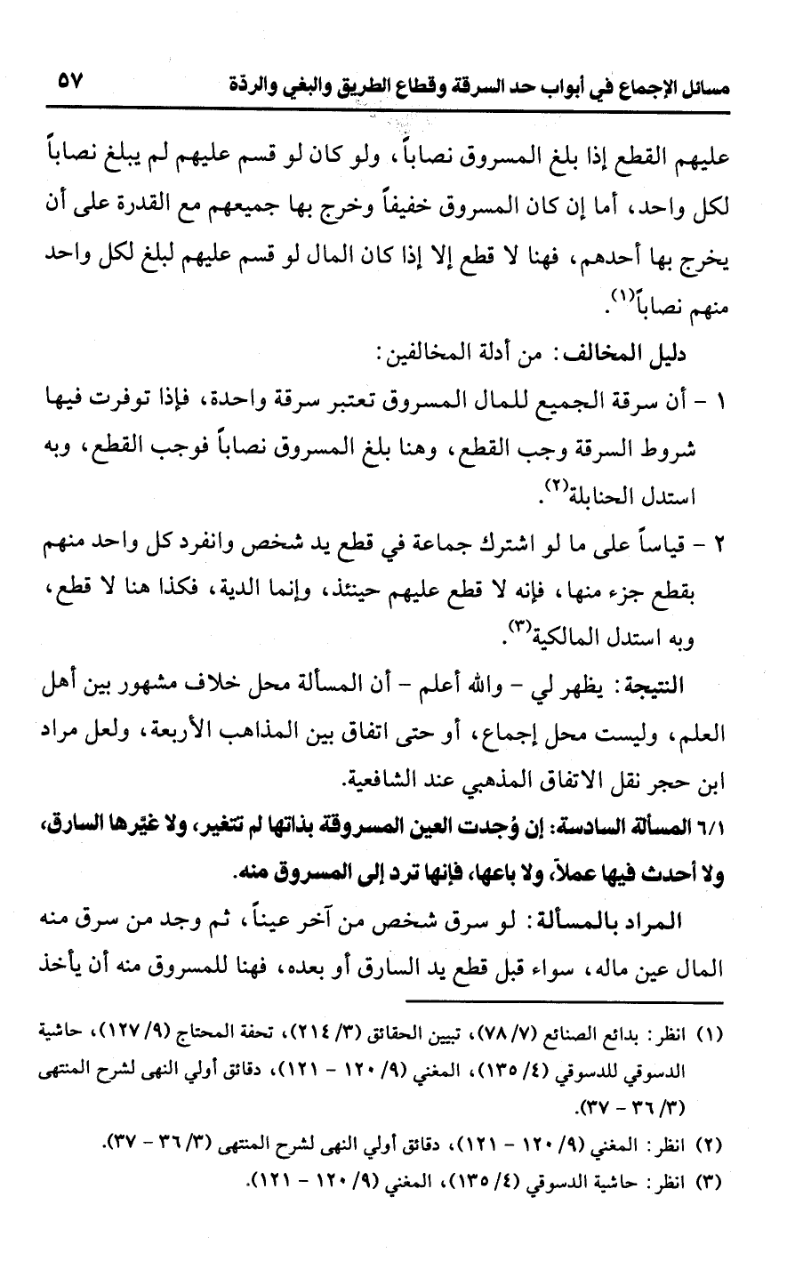 [6/ 1] المسألة السادسة: إن وُجدت العين المسروقة بذاتها لم تتغير، ولا غيَّرها السارق، ولا أحدث فيها عملًا، ولا باعها، فإنها ترد إلى المسروق منه.
