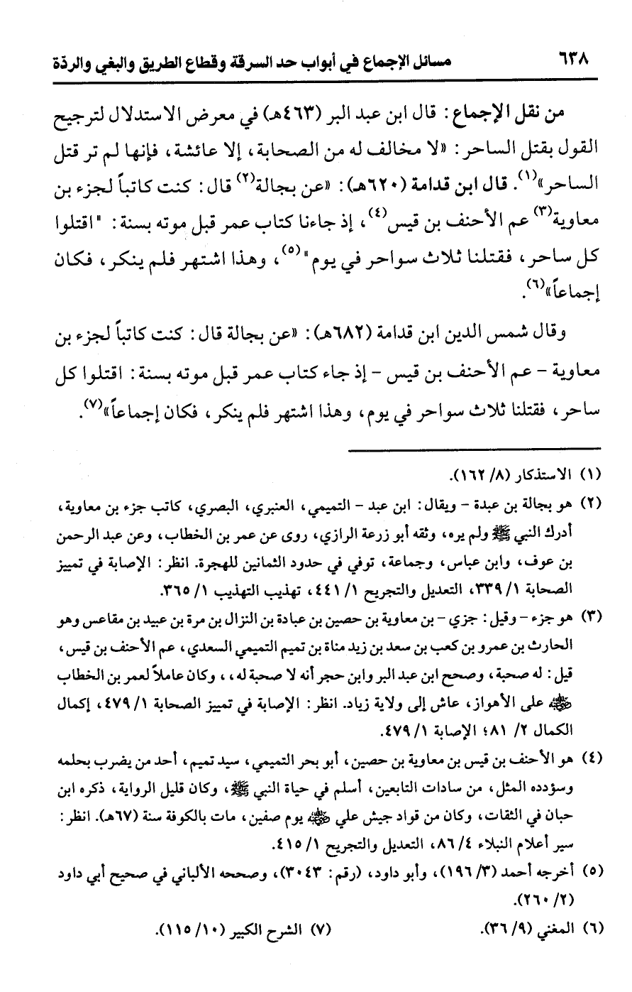 • من نقل الإجماع: قال ابن عبد البر (463 هـ) في معرض الاستدلال لترجيح القول بقتل الساحر: "لا مخالف له من الصحابة، إلا عائشة، فإنها لم تر قتل الساحر" (¬1). قال ابن قدامة (620 هـ): "عن بجالة (¬2) قال: كنت كاتبًا لجزء بن معاوية (¬3) عم الأحنف بن قيس (¬4)، إذ جاءنا كتاب عمر قبل موته بسنة: "اقتلوا كل ساحر، فقتلنا ثلاث سواحر في يوم" (¬5)، وهذا اشتهر فلم ينكر، فكان إجماعًا" (¬6).