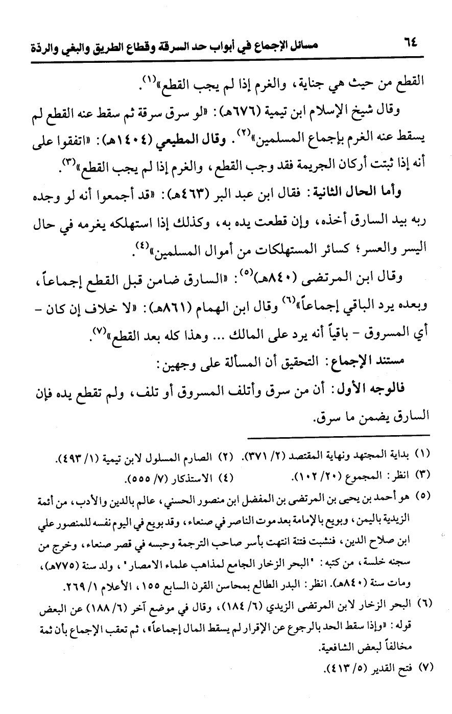 (¬6) البحر الزخار لابن المرتضى الزيدي (6/ 184)، وقال في موضع آخر (6/ 188) عن البعض قوله: "وإذا سقط الحد بالرجوع عن الإقرار لم يسقط المال إجماعًا"، ثم تعقب الإجماع بأن ثمة مخالفًا لبعض الشافعية.