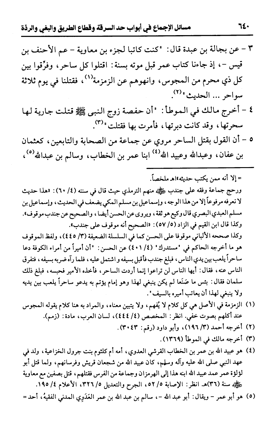3 - عن بجالة بن عبدة قال: "كنت كاتبا لجزء بن معاوية -عم الأحنف بن قيس-، إذ جاءنا كتاب عمر قبل موته بسنة: اقتلوا كل ساحر، وفرِّقوا بين كل ذي محرم من المجوس، وانهوهم عن الزمزمة (¬1)، فقتلنا في يوم ثلاثة سواحر. . . الحديث" (¬2).