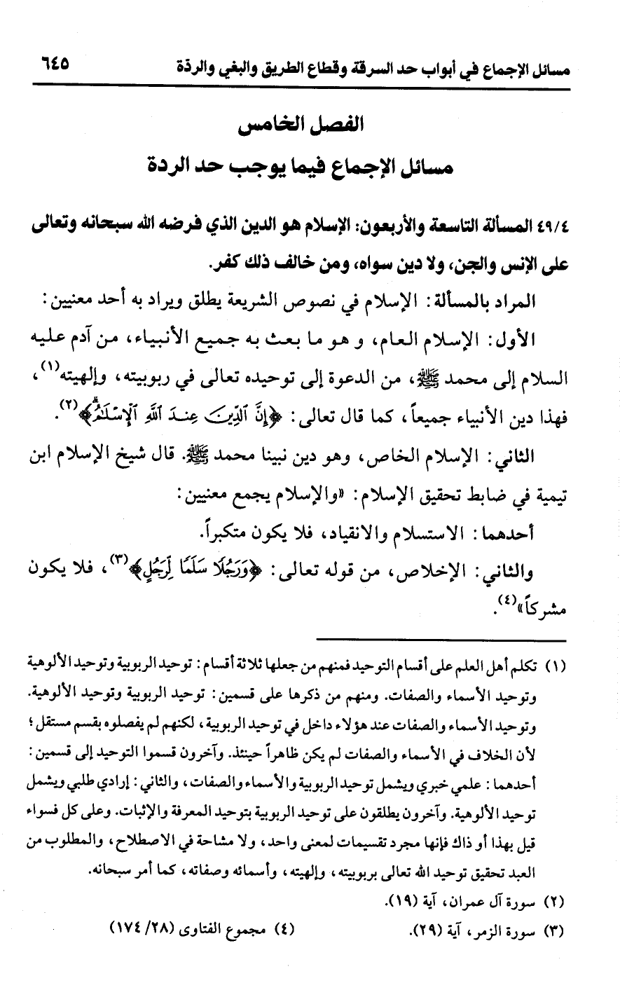 [49/ 4] المسألة التاسعة والأربعون: الإسلام هو الدين الذي فرضه اللَّه سبحانه وتعالى على الإنس والجن، ولا دين سواه، ومن خالف ذلك كفر.