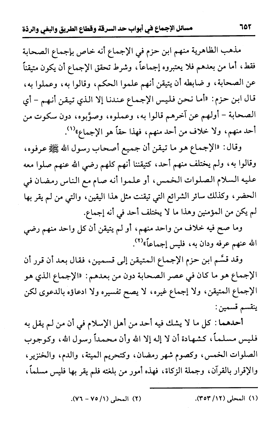 وقد قسَّم ابن حزم الإجماع المتيقن إلى قسمين، فقال بعد أن قرر أن الإجماع هو ما كان في عصر الصحابة دون من بعدهم: "الإجماع الذي هو الإجماع المتيقن، ولا إجماع غبره، لا يصح تفسيره ولا ادعاؤه بالدعوى لكن ينقسم قسمين: