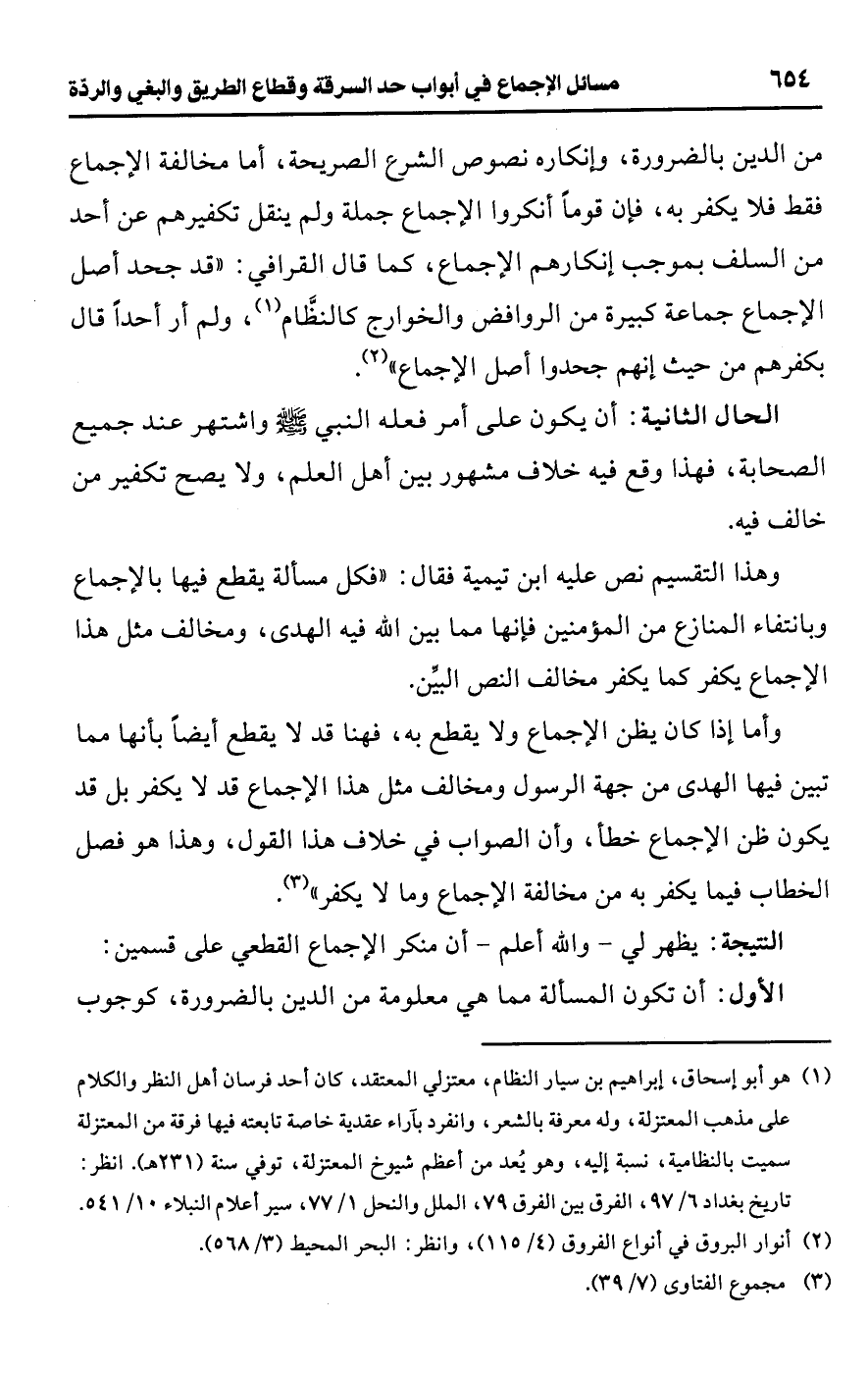 وهذا التقسيم نص عليه ابن تيمية فقال: "فكل مسألة يقطع فيها بالإجماع وبانتفاء المنازع من المؤمنين فإنها مما بين اللَّه فيه الهدى، ومخالف مثل هذا الإجماع يكفر كما يكفر مخالف النص البيِّن.