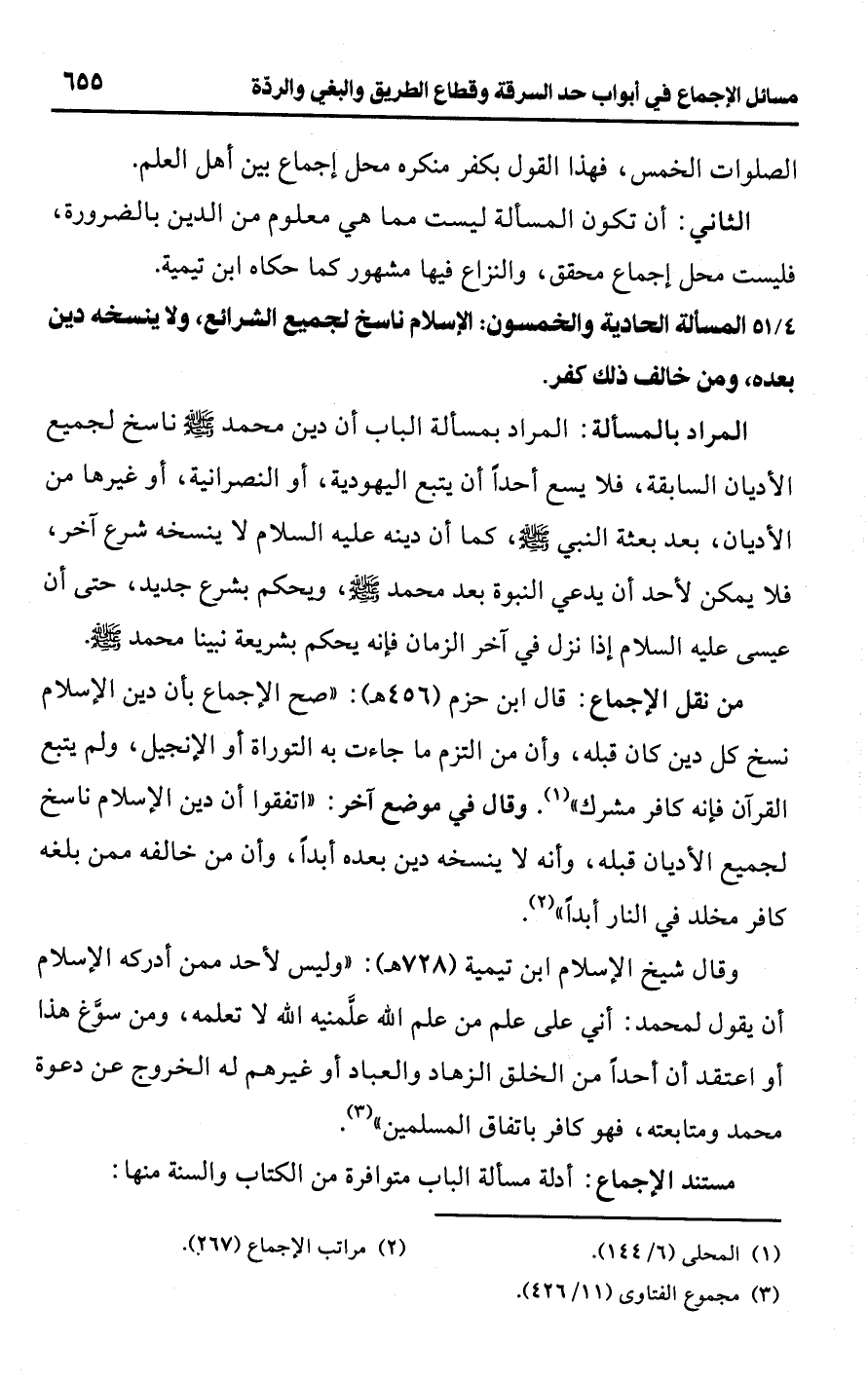 [51/ 4] المسألة الحادية والخمسون: الإسلام ناسخ لجميع الشرائع، ولا ينسخه دين بعده، ومن خالف ذلك كفر.