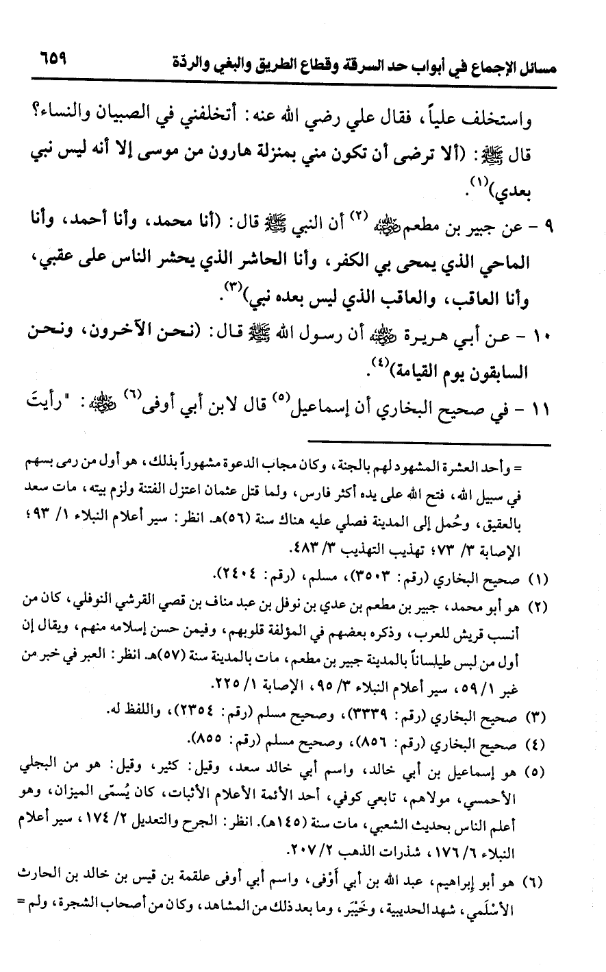 9 - عن جبير بن مطعم -رضي اللَّه عنه- (¬2) أن النبي -صلى اللَّه عليه وسلم- قال: (أنا محمد، وأنا أحمد، وأنا الماحي الذي يمحى بي الكفر، وأنا الحاشر الذي يحشر الناس على عقبي، وأنا العاقب، والعاقب الذي ليس بعده نبي) (¬3).