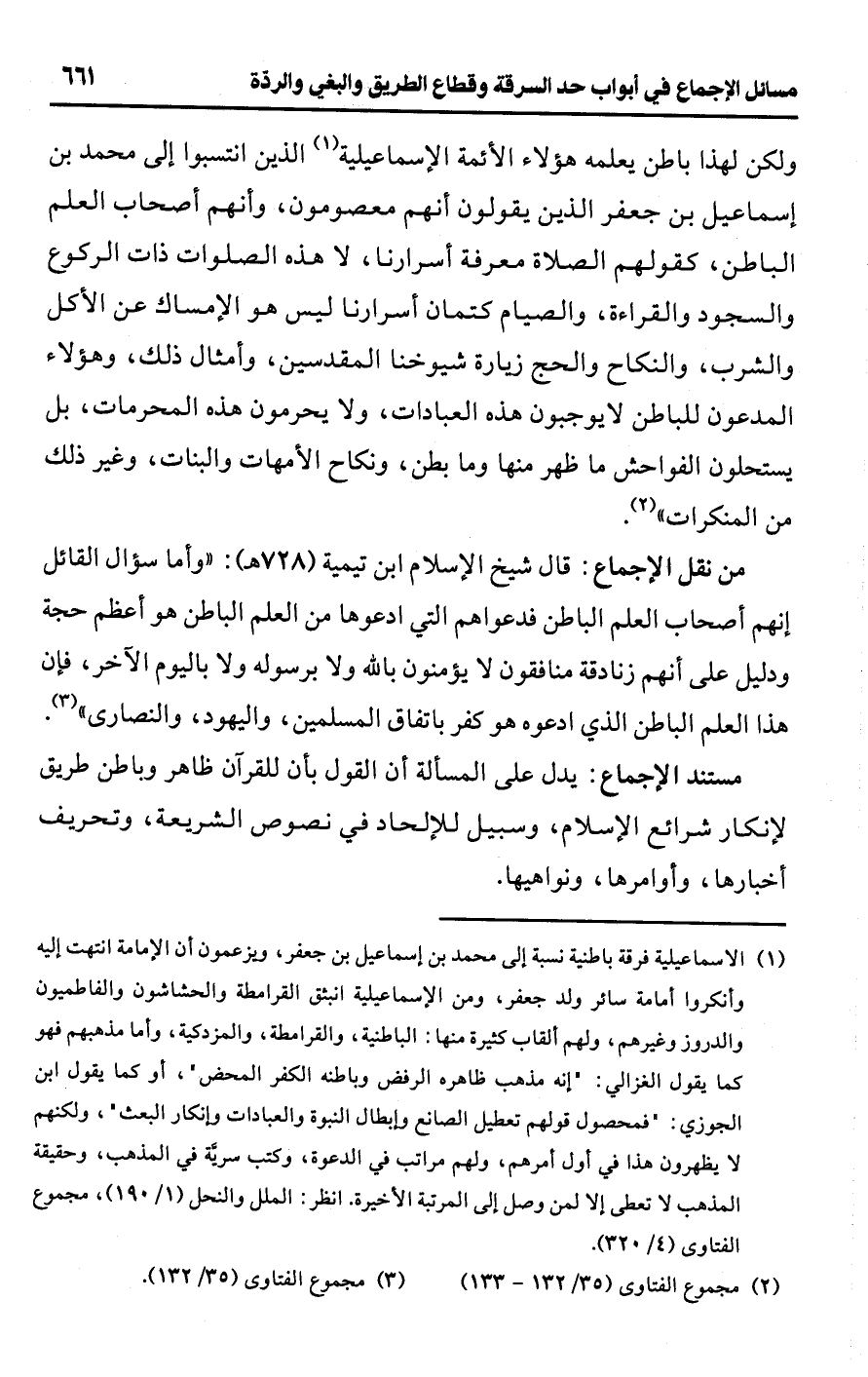 • من نقل الإجماع: قال شيخ الإسلام ابن تيمية (728 هـ): "وأما سؤال القائل إنهم أصحاب العلم الباطن فدعواهم التي ادعوها من العلم الباطن هو أعظم حجة ودليل على أنهم زنادقة منافقون لا يؤمنون باللَّه ولا برسوله ولا باليوم الآخر، فإن هذا العلم الباطن الذي ادعوه هو كفر باتفاق المسلمين، واليهود، والنصارى" (¬3).