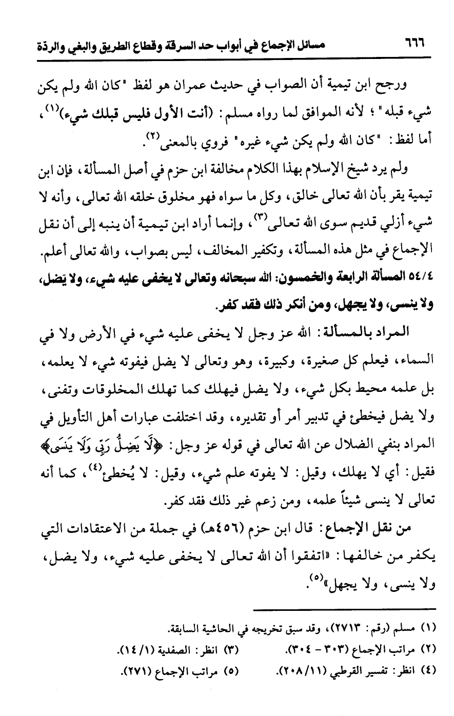 • من نقل الإجماع: قال ابن حزم (456 هـ) في جملة من الاعتقادات التي يكفر من خالفها: "اتفقوا أن اللَّه تعالى لا يخفى عليه شيء، ولا يضل، ولا ينسى، ولا يجهل" (¬5).