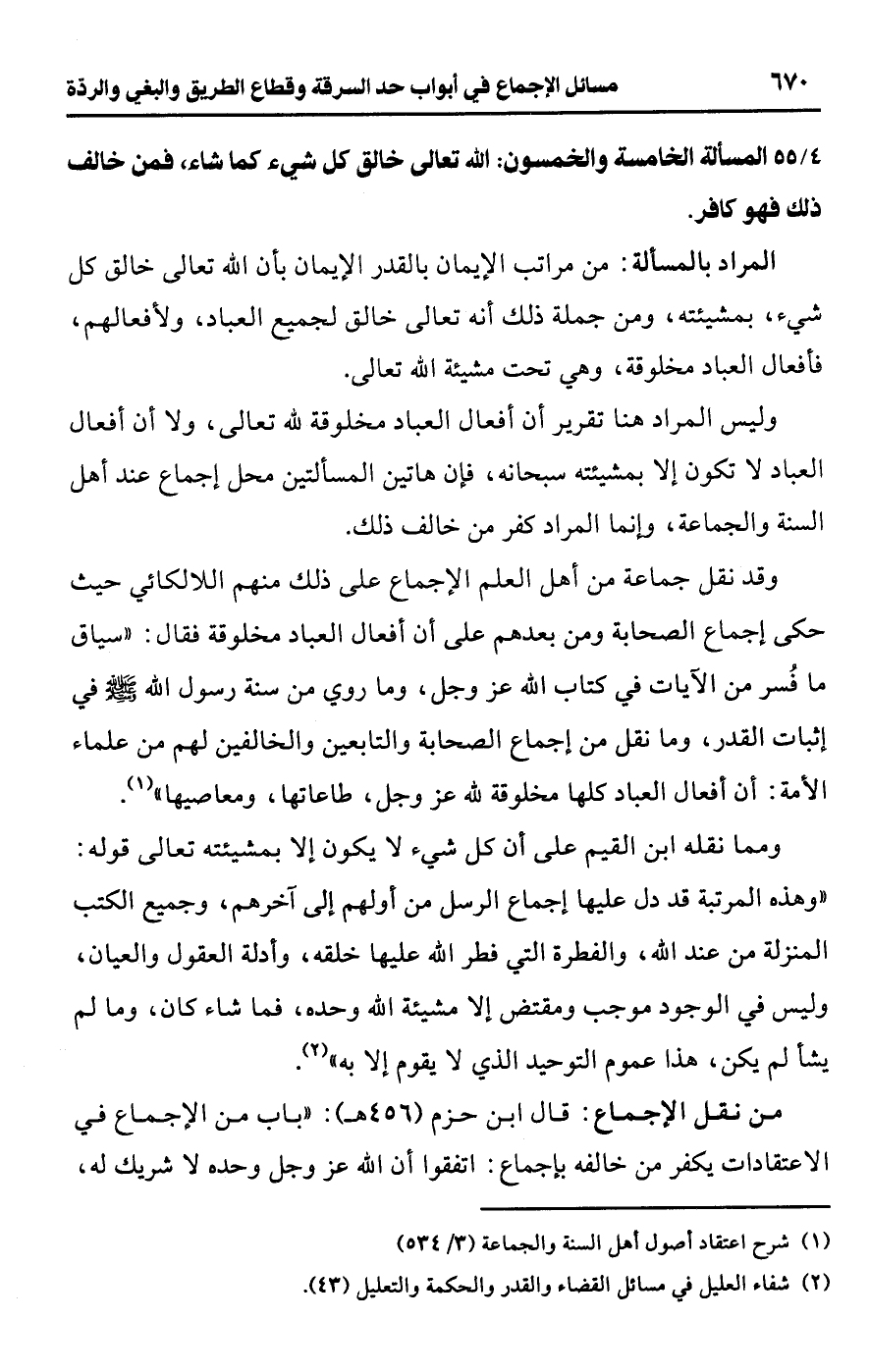 وليس المراد هنا تقرير أن أفعال العباد مخلوقة للَّه تعالى، ولا أن أفعال العباد لا تكون إلا بمشيئته سبحانه، فإن هاتين المسألتين محل إجماع عند أهل السنة والجماعة، وإنما المراد كفر من خالف ذلك.