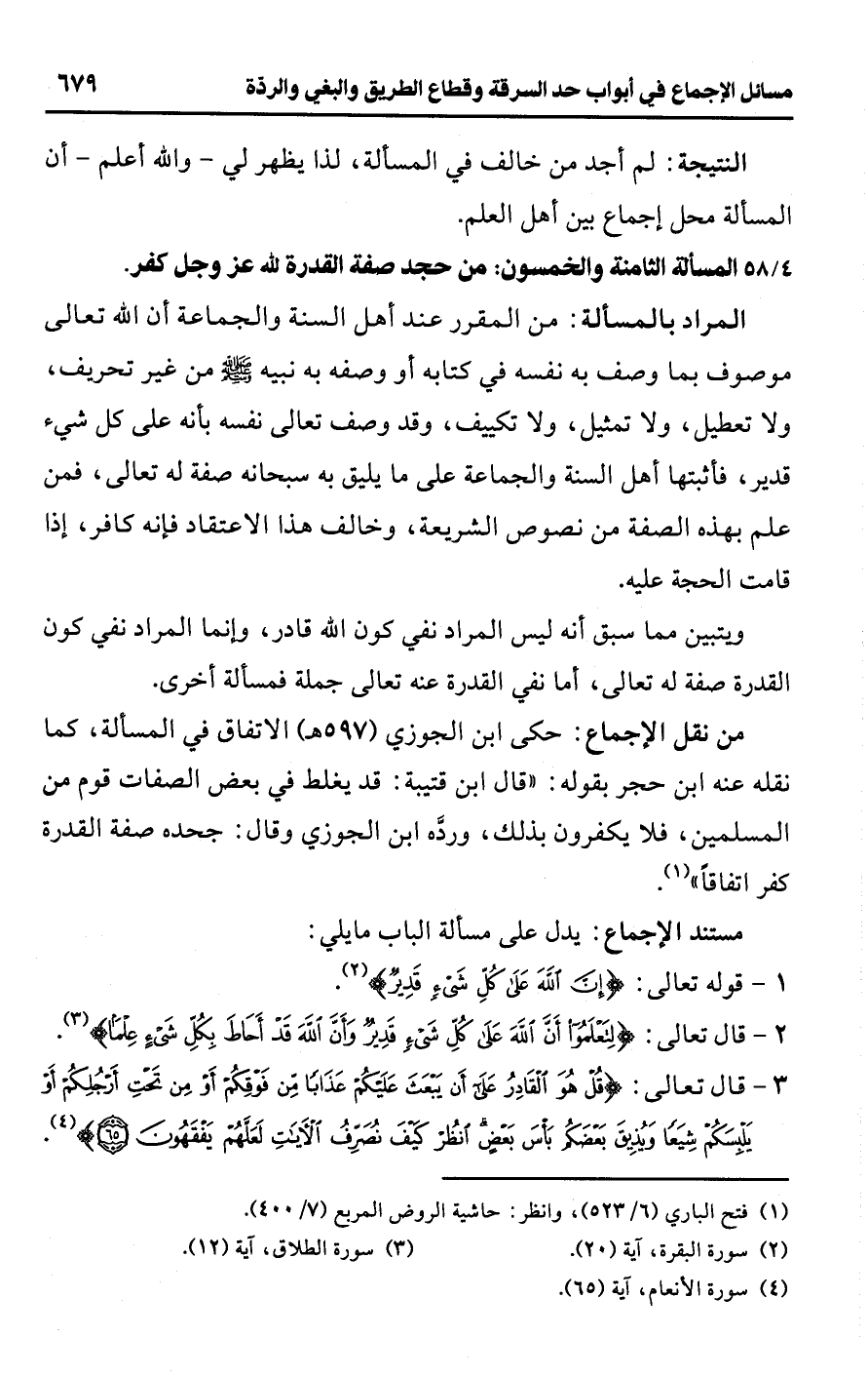 • من نقل الإجماع: حكى ابن الجوزي (597 هـ) الاتفاق في المسألة، كما نقله عنه ابن حجر بقوله: "قال ابن قتيبة: قد يغلط في بعض الصفات قوم من المسلمين، فلا يكفرون بذلك، وردَّه ابن الجوزي وقال: جحده صفة القدرة كفر اتفاقًا" (¬1).