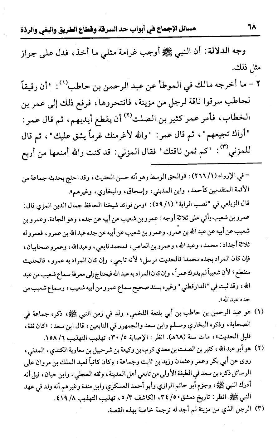 2 - ما أخرجه مالك في الموطأ عن عبد الرحمن بن حاطب (¬1): "أن رقيقًا لحاطب سرقوا ناقة لرجل من مزينة، فانتحروها، فرفع ذلك إلى عمر بن الخطاب، فأمر عمر كثير بن الصلت (¬2) أن يقطع أيديهم، ثم قال عمر: "أراك تجيعهم"، ثم قال عمر: "واللَّه لأغرمنك غرمًا يشق عليك"، ثم قال للمزني (¬3): "كم ثمن ناقتك" فقال المزني: قد كنت واللَّه أمنعها من أربع