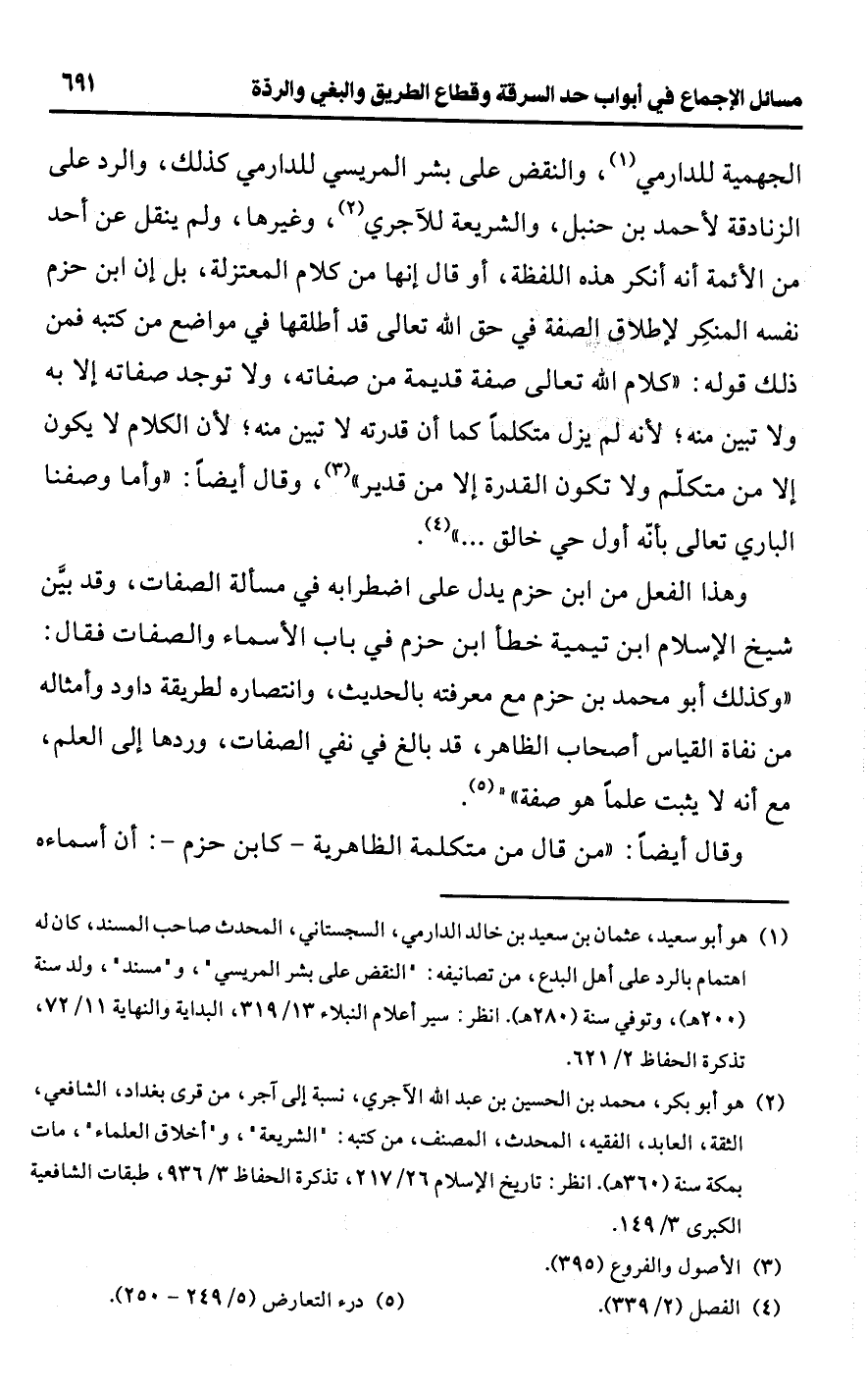 وهذا الفعل من ابن حزم يدل على اضطرابه في مسألة الصفات، وقد بيَّن شيخ الإسلام ابن تيمية خطأ ابن حزم في باب الأسماء والصفات فقال: "وكذلك أبو محمد بن حزم مع معرفته بالحديث، وانتصاره لطريقة داود وأمثاله من نفاة القياس أصحاب الظاهر، قد بالغ في نفي الصفات، وردها إلى العلم، مع أنه لا يثبت علمًا هو صفة" (¬5).