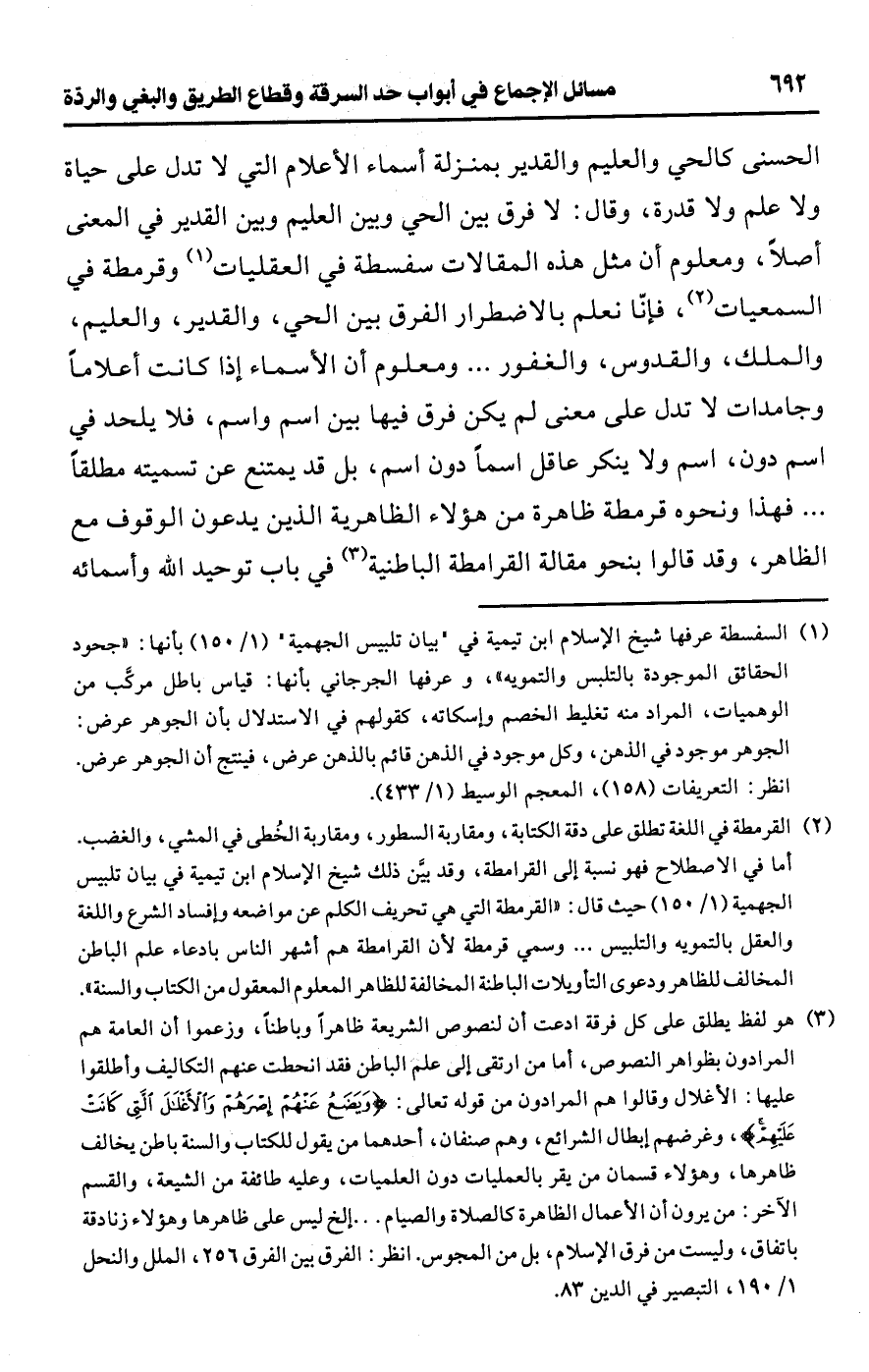(¬2) القرمطة في اللغة تطلق على دقة الكتابة، ومقاربة السطور، ومقاربة الخُطى في المشي، والغضب. أما في الاصطلاح فهو نسبة إلى القرامطة، وقد بيَّن ذلك شيخ الإسلام ابن تيمية في بيان تلبيس الجهمية (1/ 150) حيث قال: "القرمطة التي هي تحريف الكلم عن مواضعه وإفساد الشرع واللغة والعقل بالتمويه والتلبيس. . . وسمي قرمطة لأن القرامطة هم أشهر الناس بادعاء علم الباطن المخالف للظاهر ودعوى التأويلات الباطنة المخالفة للظاهر المعلوم المعقول من الكتاب والسنة".