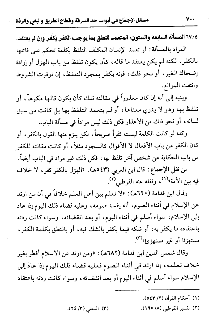 • من نقل الإجماع: قال ابن العربي (543 هـ): "الهزل بالكفر كفر، لا خلاف فيه بين الأمة" (¬1)، ونقله عنه القرطبي (¬2).