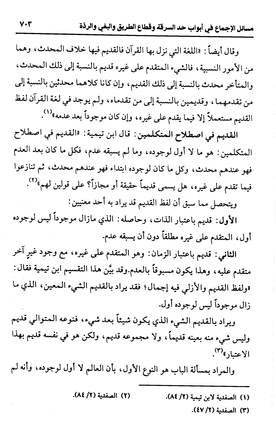 • القديم في اصطلاح المتكلمين: قال ابن تيمية: "القديم في اصطلاح المتكلمين: هو ما لا أول لوجوده، وما لم يسبقه عدم، فكل ما كان بعد العدم فهو عندهم محدث، وكل ما كان لوجوده ابتداء فهو عندهم محدث، ثم تنازعوا فيما تقدم على غيره، هل يسمى قديمًا حقيقة أو مجازًا؛ على قولين لهم" (¬2).