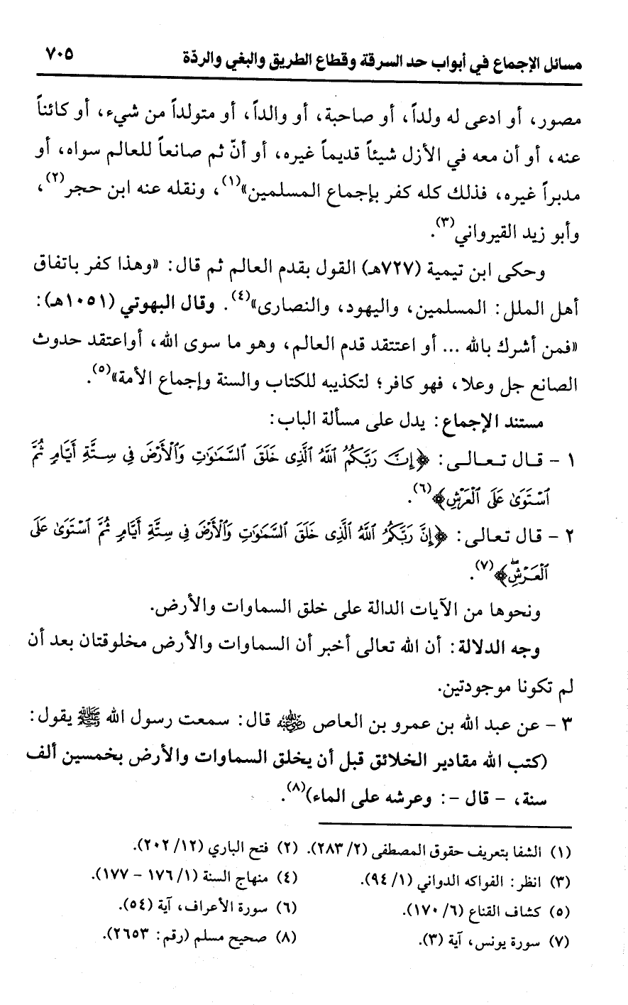وحكى ابن تيمية (727 هـ) القول بقدم العالم ثم قال: "وهذا كفر باتفاق أهل الملل: المسلمين، واليهود، والنصارى" (¬4). وقال البهوتي (1051 هـ): "فمن أشرك باللَّه. . . أو اعتقد قدم العالم، وهو ما سوى اللَّه، أو اعتقد حدوث الصانع جل وعلا، فهو كافر؛ لتكذيبه للكتاب والسنة وإجماع الأمة" (¬5).