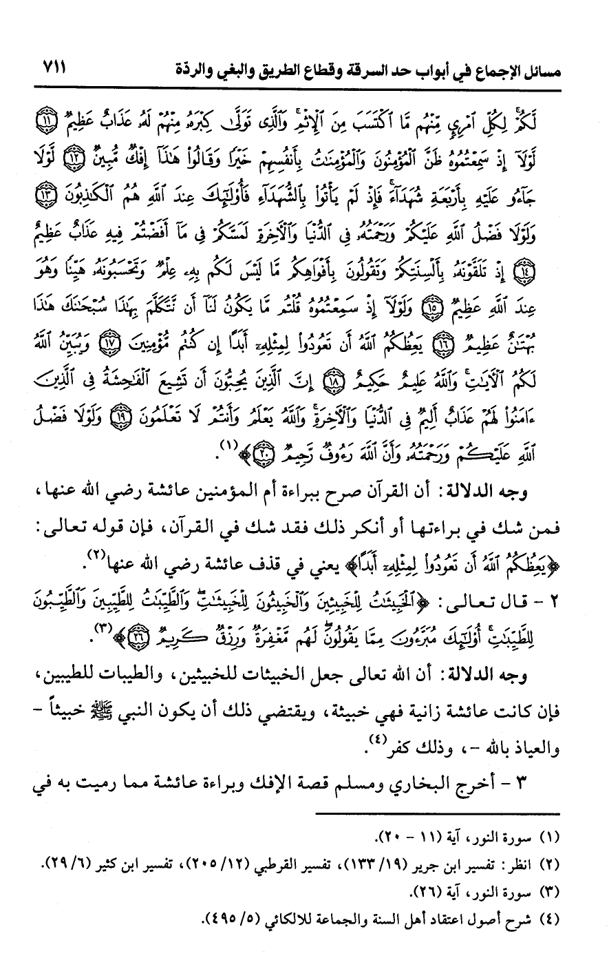 • وجه الدلالة: أن القرآن صرح ببراءة أم المؤمنين عائشة رضي اللَّه عنها، فمن شك في براءتها أو أنكر ذلك فقد شك في القرآن، فإن قوله تعالى: {يَعِظُكُمُ اللَّهُ أَنْ تَعُودُوا لِمِثْلِهِ أَبَدًا} يعني في قذف عائشة رضي اللَّه عنها (¬2).
