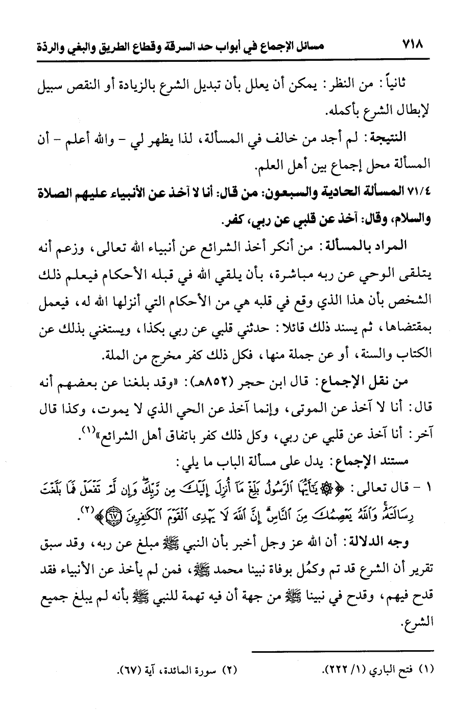 [71/ 4] المسألة الحادية والسبعون: من قال: أنا لا آخذ عن الأنبياء عليهم الصلاة والسلام، وقال: آخذ عن قلبي عن ربي، كفر.