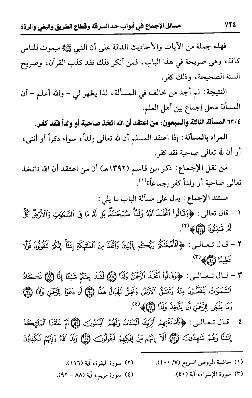 • من نقل الإجماع: ذكر ابن قاسم (1392 هـ) أن من اعتقد أن اللَّه "اتخذ تعالى صاحبة أو ولدًا كفر إجماعًا" (¬1).