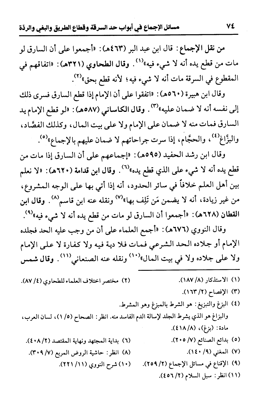 • من نقل الإجماع: قال ابن عبد البر (463 هـ): "أجمعوا على أن السارق لو مات من قطع يده أنه لا شيء فيه" (¬1). وقال الطحاوي (321 هـ): "اتفاقهم في المقطوع في السرقة مات أنه لا شيء فيه؛ لأنه قطع بحق" (¬2).