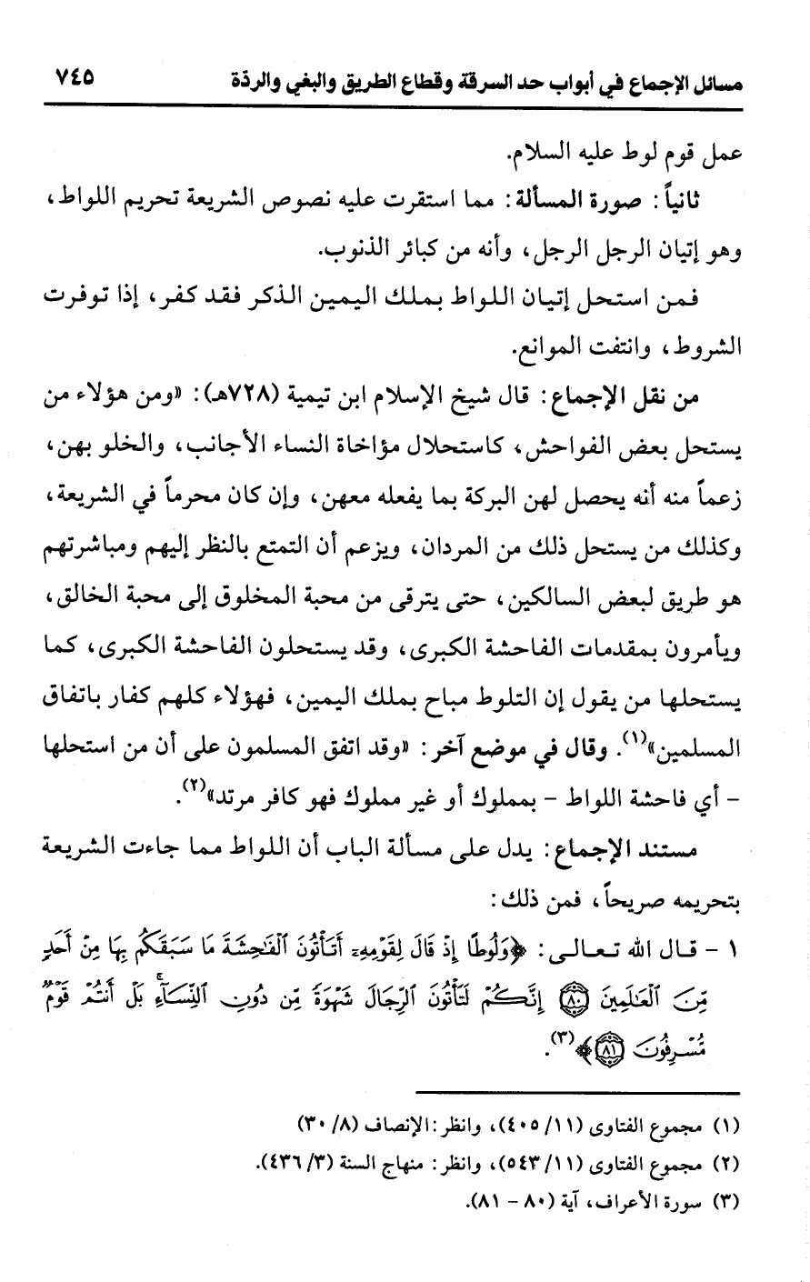 • من نقل الإجماع: قال شيخ الإسلام ابن تيمية (728 هـ): "ومن هؤلاء من يستحل بعض الفواحش "كاستحلال مؤاخاة النساء الأجانب، والخلو بهن، زعمًا منه أنه يحصل لهن البركة بما يفعله معهن، وإن كان محرمًا في الشريعة، وكذلك من يستحل ذلك من المردان، ويزعم أن التمتع بالنظر إليهم ومباشرتهم هو طريق لبعض السالكين، حتى يترقى من محبة المخلوق إلى محبة الخالق، ويأمرون بمقدمات الفاحشة الكبرى، وقد يستحلون الفاحشة الكبرى، كما يستحلها من يقول إن التلوط مباح بملك اليمين، فهؤلاء كلهم كفار باتفاق المسلمين" (¬1). وقال في موضع آخر: "وقد اتفق المسلمون على أن من استحلها -أي فاحشة اللواط- بمملوك أو غير مملوك فهو كافر مرتد" (¬2).