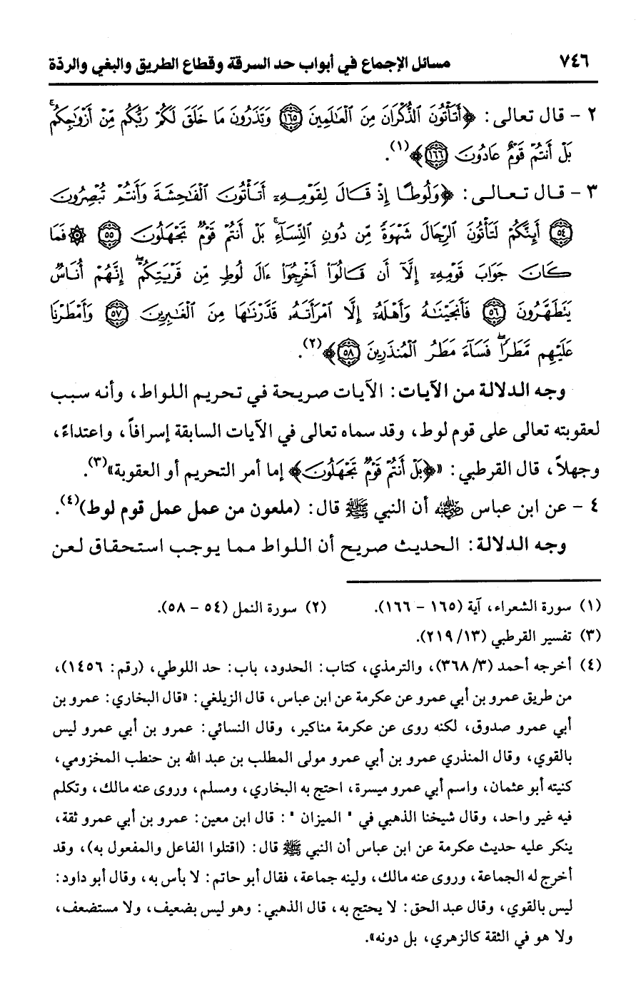• وجه الدلالة من الآيات: الآيات صريحة في تحريم اللواط، وأنه سبب لعقوبته تعالى على قوم لوط، وقد سماه تعالى في الآيات السابقة إسرافًا، واعتداءً، وجهلًا، قال القرطبي: " {بَلْ أَنْتُمْ قَوْمٌ تَجْهَلُونَ} إما أمر التحريم أو العقوبة" (¬3).