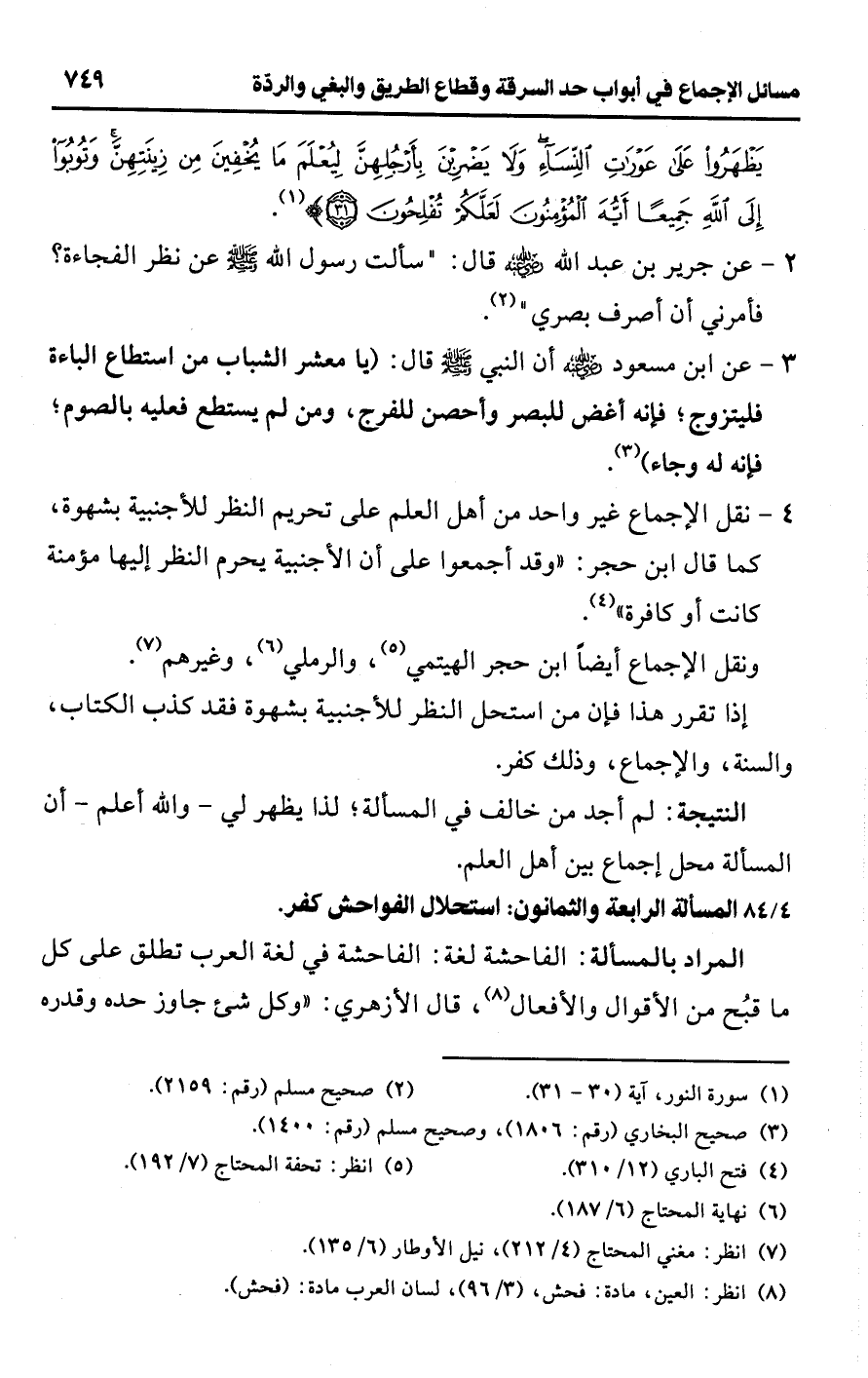 4 - نقل الإجماع غير واحد من أهل العلم على تحريم النظر للأجنبية بشهوة، كما قال ابن حجر: "وقد أجمعوا على أن الأجنبية يحرم النظر إليها مؤمنة كانت أو كافرة" (¬4).