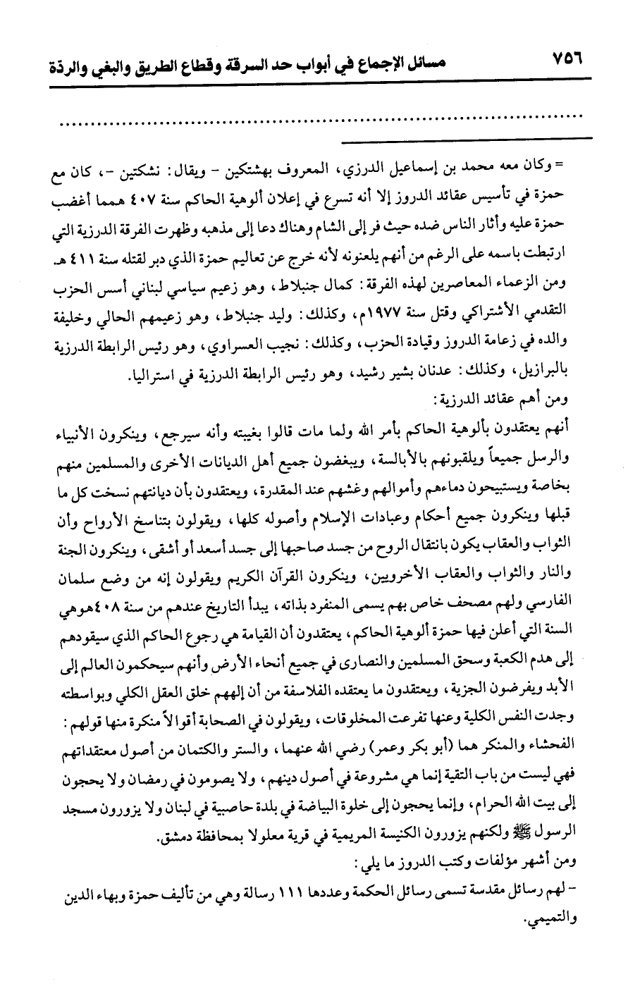 أنهم يعتقدون بألوهية الحاكم بأمر اللَّه ولما مات قالوا بغيبته وأنه سيرجع، وينكرون الأنبياء والرسل جميعًا ويلقبونهم بالأبالسة، ويبغضون جميع أهل الديانات الأخرى والمسلمين منهم بخاصة ويستبيحون دماءهم وأموالهم وغشهم عند المقدرة، ويعتقدون بأن ديانتهم نسخت كل ما قبلها وينكرون جميع أحكام وعبادات الإسلام وأصوله كلها، ويقولون بتناسخ الأرواح وأن الثواب والعقاب يكون بانتقال الروح من جسد صاحبها إلى جسد أسعد أو أشقى، وينكرون الجنة والنار والثواب والعقاب الأخروين، وينكرون القرآن الكريم ويقولون إنه من وضع سلمان الفارسي ولهم مصحف خاص بهم يسمى المنفرد بذاته، يبدأ التاريخ عندهم من سنة 408 هـ وهي السنة التي أعلن فيها حمزة ألوهية الحاكم، يعتقدون أن القيامة هي رجوع الحاكم الذي سيقودهم إلى هدم الكعبة وسحق المسلمين والنصارى في جميع أنحاء الأرض وأنهم سيحكمون العالم إلى الأبد ويفرضون الجزية، ويعتقدون ما يعتقده الفلاسفة من أن إلههم خلق العقل الكلي وبواسطته وجدت النفس الكلية وعنها تفرعت المخلوقات، ويقولون في الصحابة أقوالًا منكرة منها قولهم: الفحشاء والمنكر هما (أبو بكر وعمر) رضي اللَّه عنهما، والستر والكتمان من أصول معتقداتهم فهي ليست من باب التقية إنما هي مشروعة في أصول دينهم، ولا يصومون في رمضان ولا يحجون إلى بيت اللَّه الحرام، وإنما يحجون إلى خلوة البياضة في بلدة حاصبية في لبنان ولا يزورون مسجد الرسول -صلى اللَّه عليه وسلم- ولكنهم يزورون الكنيسة المريمية في قرية معلولا بمحافظة دمشق. ومن أشهر مؤلفات وكتب الدروز ما يلي:
