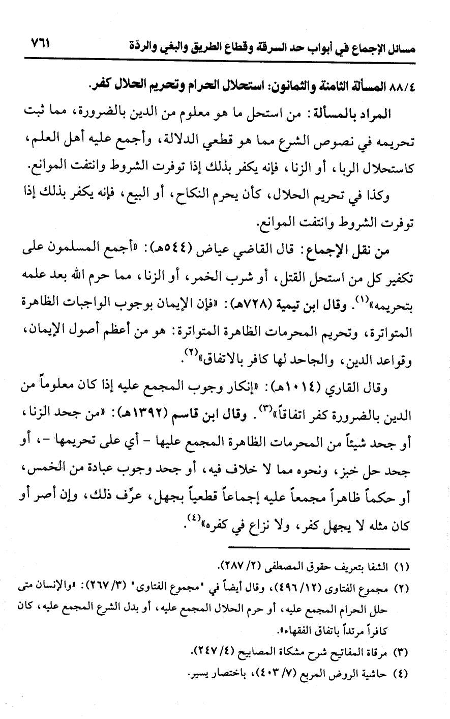 [88/ 4] المسألة الثامنة والثمانون: استحلال الحرام وتحريم الحلال كفر.