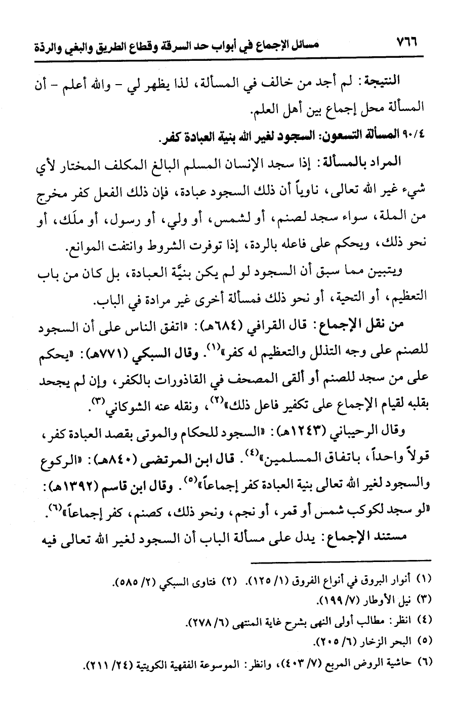 • من نقل الإجماع: قال القرافي (684 هـ): "اتفق الناس على أن السجود للصنم على وجه التذلل والتعظيم له كفر" (¬1). وقال السبكي (771 هـ): "يحكم على من سجد للصنم أو ألقى المصحف في القاذورات بالكفر، وإن لم يجحد بقلبه لقيام الإجماع على تكفير فاعل ذلك" (¬2)، ونقله عنه الشوكاني (¬3).