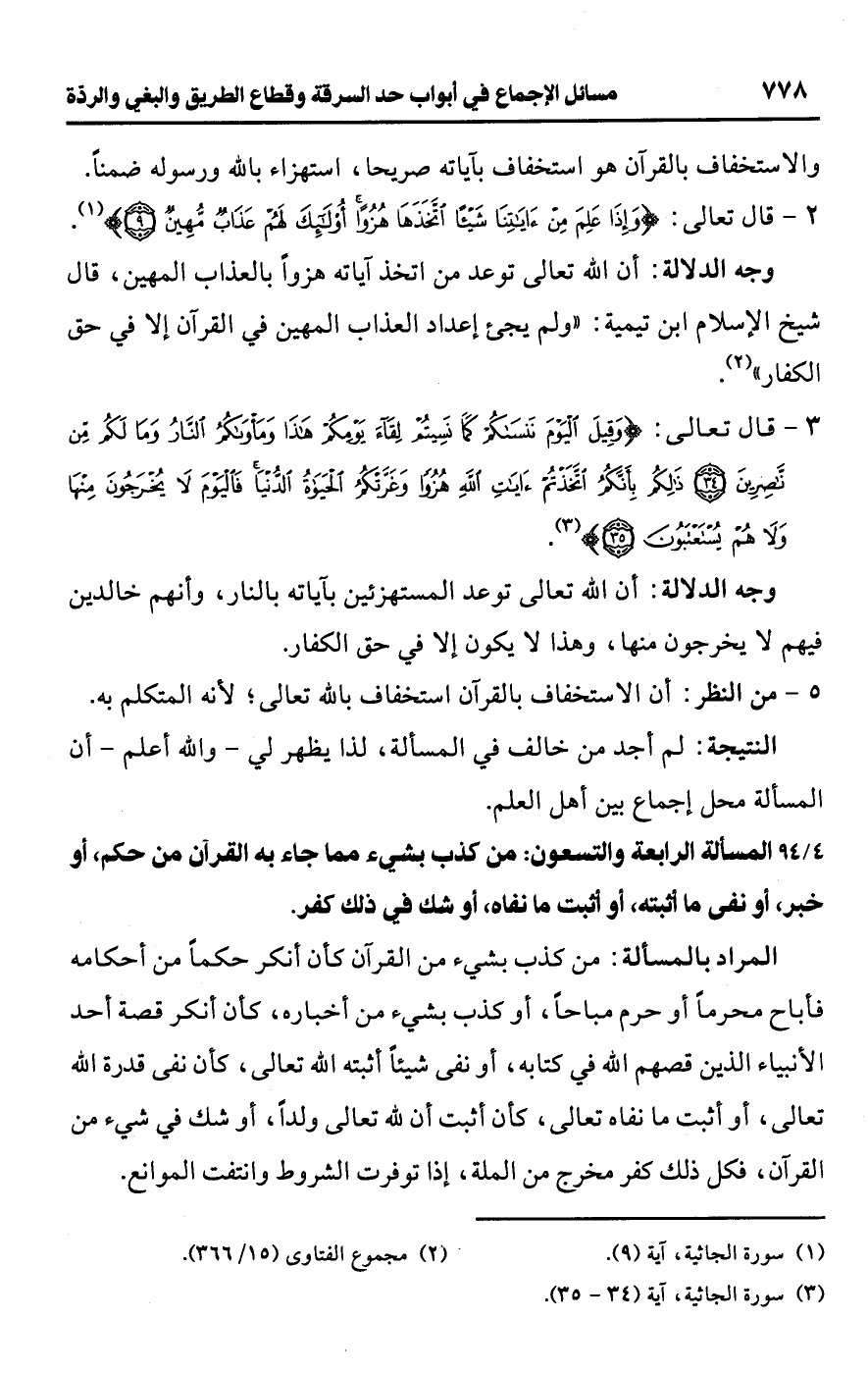 [94/ 4] المسألة الرابعة والتسعون: من كذب بشيء مما جاء به القرآن من حكم، أو خبر، أو نفى ما أثبته، أو أثبت ما نفاه، أو شك في ذلك كفر.
