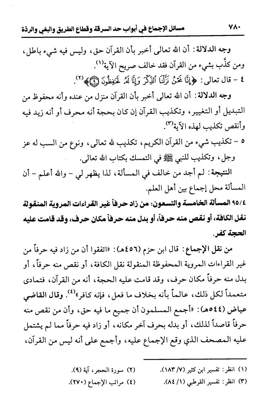 • من نقل الإجماع: قال ابن حزم (456 هـ): "اتفقوا أن من زاد فيه حرفًا من غير القراءات المروية المحفوظة المنقولة نقل الكافة، أو نقص منه حرفًا، أو بدل منه حرفًا مكان حرف، وقد قامت عليه الحجة، أنه من القرآن، فتمادى متعمدًا لكل ذلك، عالمًا بأنه بخلاف ما فعل، فإنه كافر" (¬4). وقال القاضي عياض (544 هـ): "أجمع المسلمون أن جميع ما فيه حق، وأن من نقص منه حرفًا قاصدًا لذلك، أو بدله بحرف آخر مكانه، أو زاد فيه حرفًا مما لم يشتمل عليه المصحف الذي وقع الإجماع عليه، وأجمع على أنه ليس من القرآن،