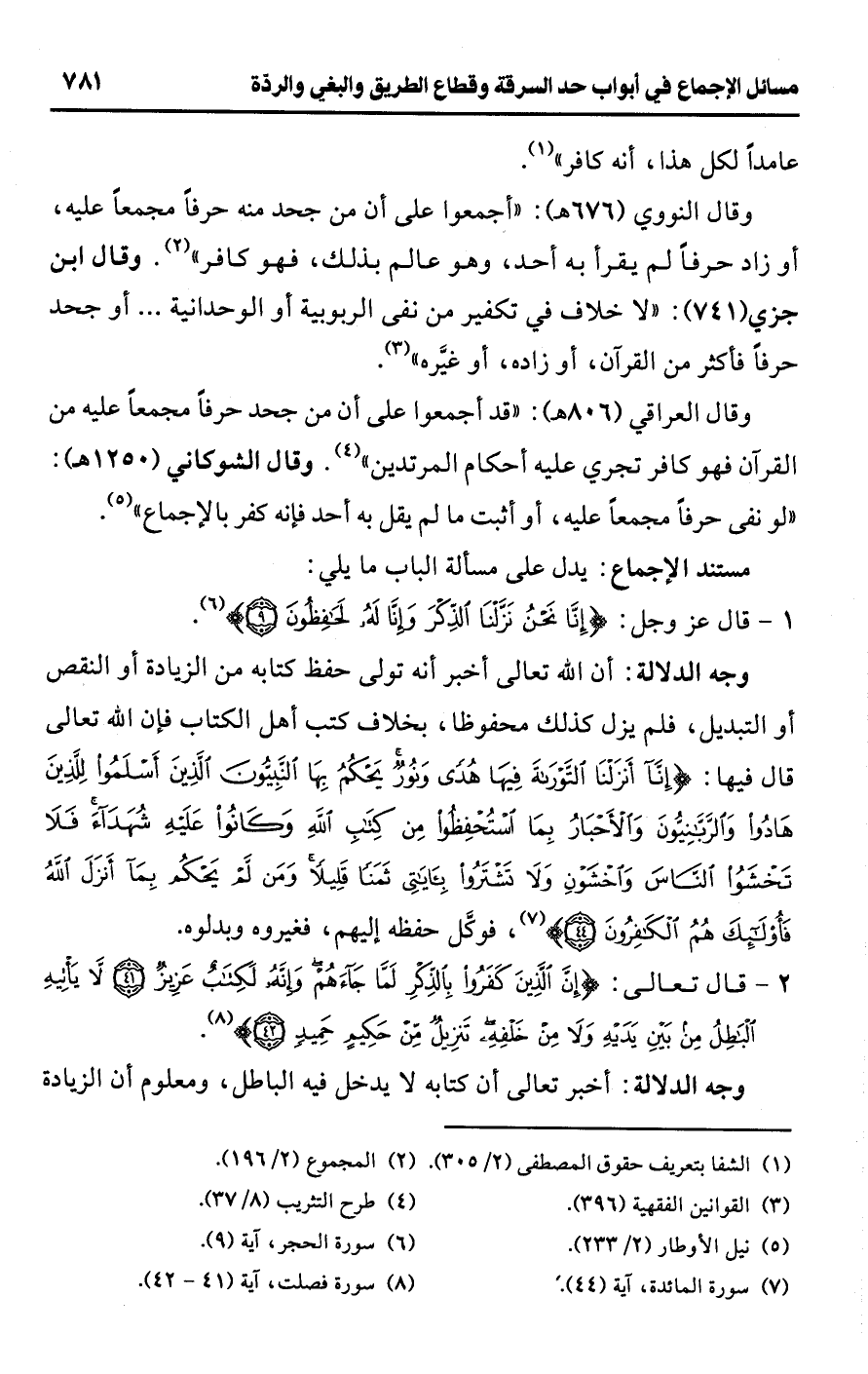وقال العراقي (806 هـ): "قد أجمعوا على أن من جحد حرفًا مجمعًا عليه من القرآن فهو كافر تجري عليه أحكام المرتدين" (¬4). وقال الشوكاني (1250 هـ): "لو نفى حرفًا مجمعًا عليه، أو أثبت ما لم يقل به أحد فإنه كفر بالإجماع" (¬5).