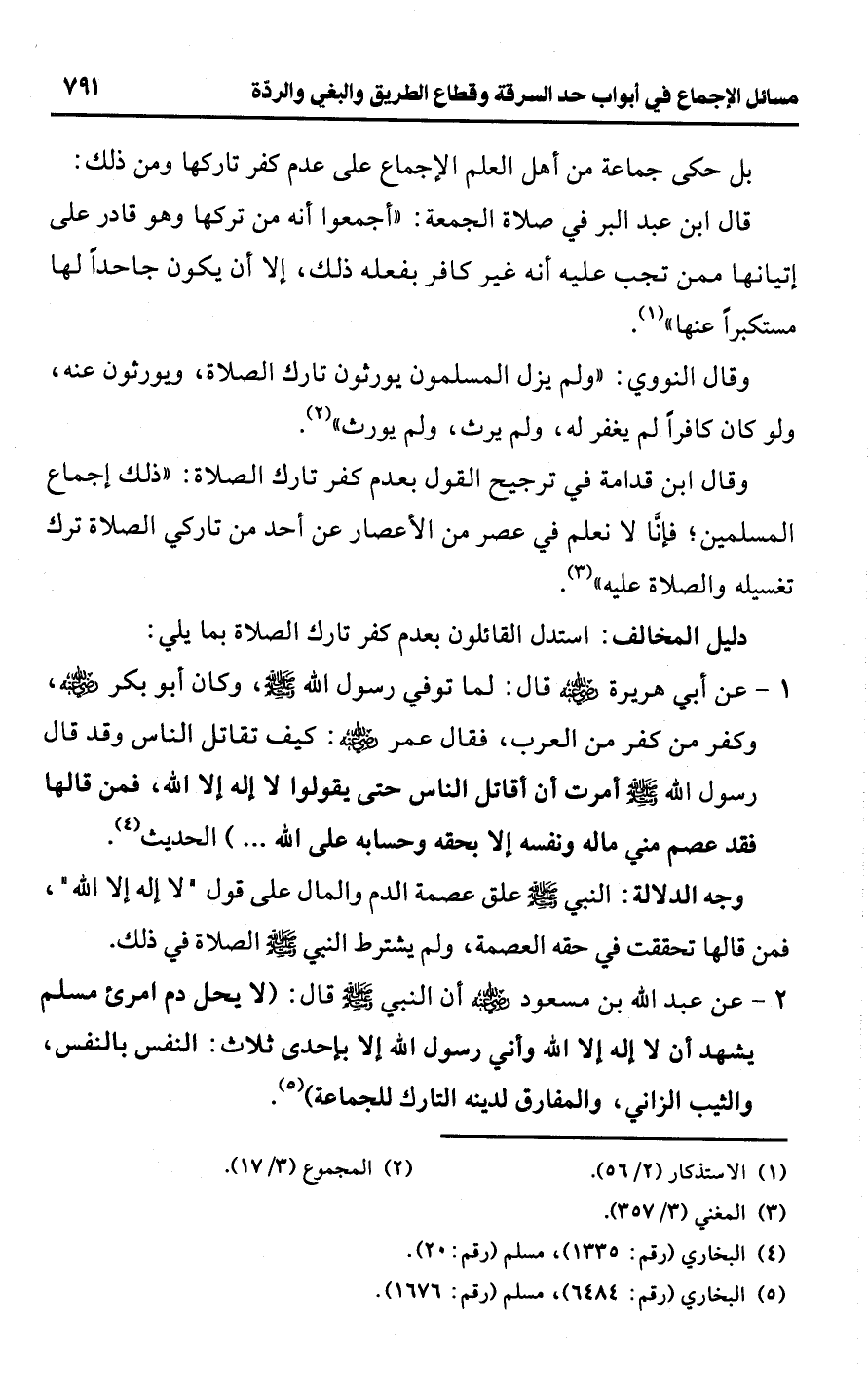 وقال ابن قدامة في ترجيح القول بعدم كفر تارك الصلاة: "ذلك إجماع المسلمين؛ فإنَّا لا نعلم في عصر من الأعصار عن أحد من تاركي الصلاة ترك تغسيله والصلاة عليه" (¬3).