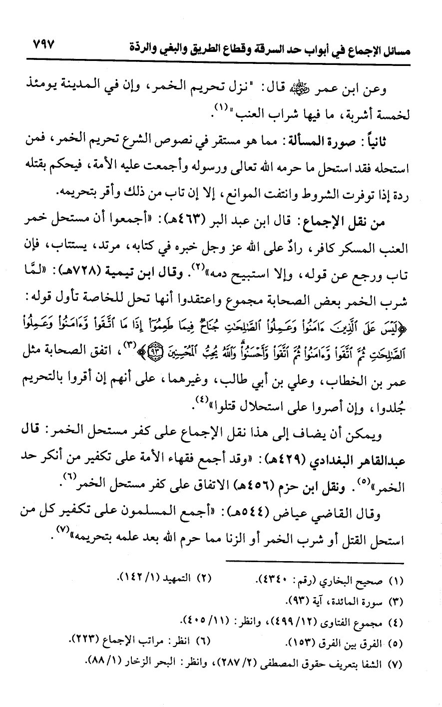 • من نقل الإجماع: قال ابن عبد البر (463 هـ): "أجمعوا أن مستحل خمر العنب المسكر كافر، راد على اللَّه عز وجل خبره في كتابه، مرتد، يستتاب، فإن تاب ورجع عن قوله، وإلا استبيح دمه" (¬2). وقال ابن تيمية (728 هـ): "لمَّا شرب الخمر بعض الصحابة مجموع واعتقدوا أنها تحل للخاصة تأول قوله: {لَيْسَ عَلَى الَّذِينَ آمَنُوا وَعَمِلُوا الصَّالِحَاتِ جُنَاحٌ فِيمَا طَعِمُوا إِذَا مَا اتَّقَوْا وَآمَنُوا وَعَمِلُوا الصَّالِحَاتِ ثُمَّ اتَّقَوْا وَآمَنُوا ثُمَّ اتَّقَوْا وَأَحْسَنُوا وَاللَّهُ يُحِبُّ الْمُحْسِنِينَ (93)} (¬3)، اتفق الصحابة مثل عمر بن الخطاب، وعلي بن أبي طالب، وغيرهما، على أنهم إن أقروا بالتحريم جُلدوا، وإن أصروا على استحلال قتلوا" (¬4).