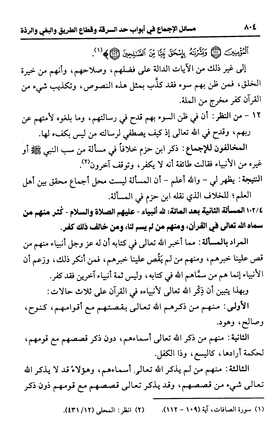 • المخالفون للإجماع: ذكر ابن حزم خلافًا في مسألة من سب النبي -صلى اللَّه عليه وسلم- أو غيره من الأنبياء فقالت طائفة أنه لا يكفر، وتوقف آخرون (¬2).Rيظهر لي -واللَّه أعلم- أن المسألة ليست محل أجماع محقق بين أهل العلم؛ للخلاف الذي نقله ابن حزم في المسألة.