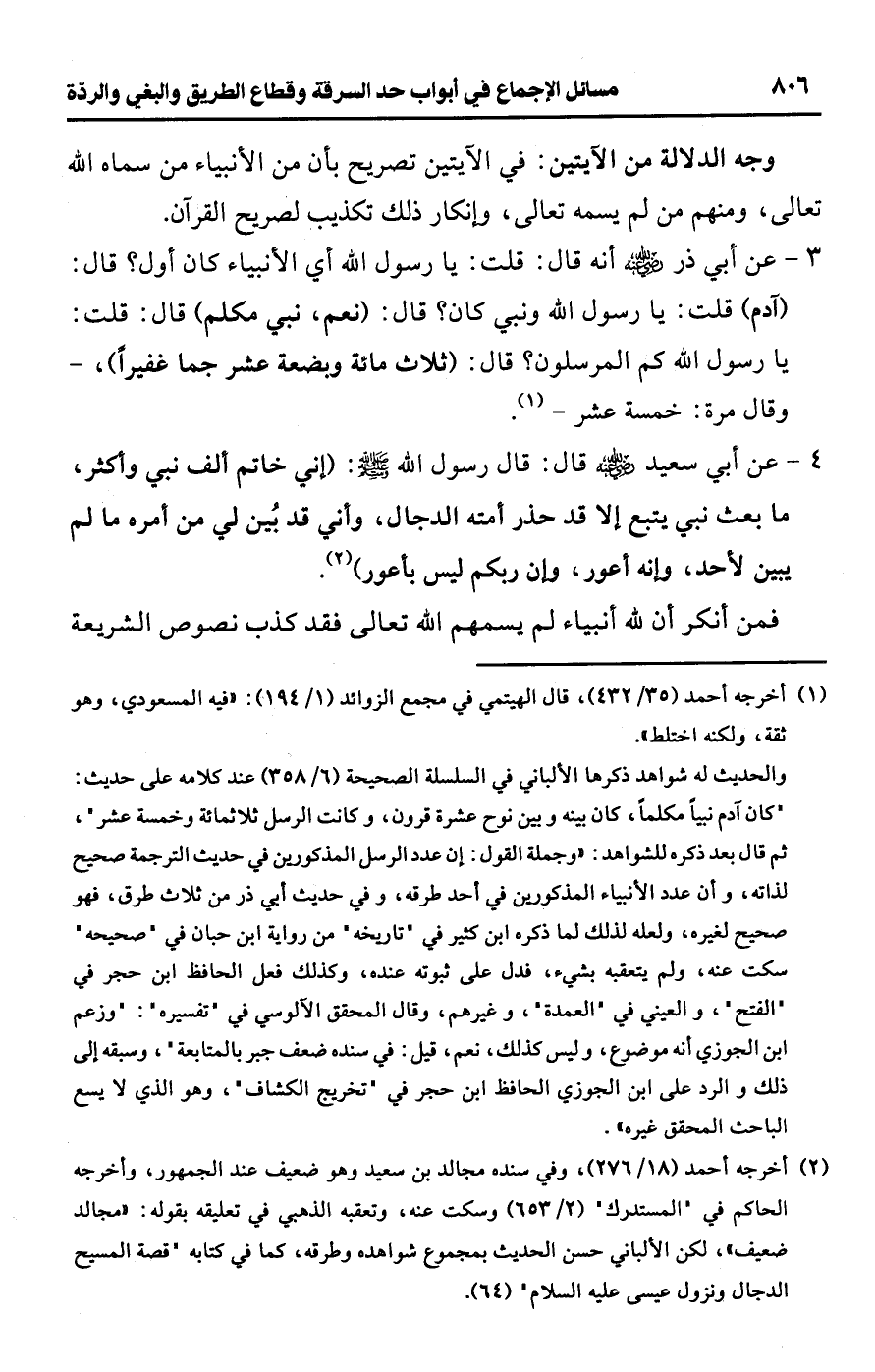 3 - عن أبي ذر -رضي اللَّه عنه- أنه قال: قلت: يا رسول اللَّه أي الأنبياء كان أول؟ قال: (آدم) قلت: يا رسول اللَّه ونبي كان؟ قال: (نعم، نبي مكلم) قال: قلت: يا رسول اللَّه كم المرسلون؟ قال: (ثلاث مائة وبضعة عشر جما غفيرًا)، -وقال مرة: خمسة عشر- (¬1).