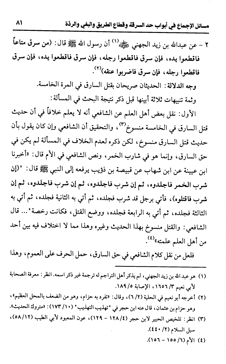 2 - عن عبد اللَّه بن زيد الجهني -رضي اللَّه عنه- (¬1) أن رسول اللَّه -صلى اللَّه عليه وسلم- قال: (من سرق متاعًا فاقطعوا يده، فإن سرق فاقطعوا رجله، فإن سرق فاقطعوا يده، فإن سرق فاقطعوا رجله، فإن سرق فاضربوا عنقه) (¬2).