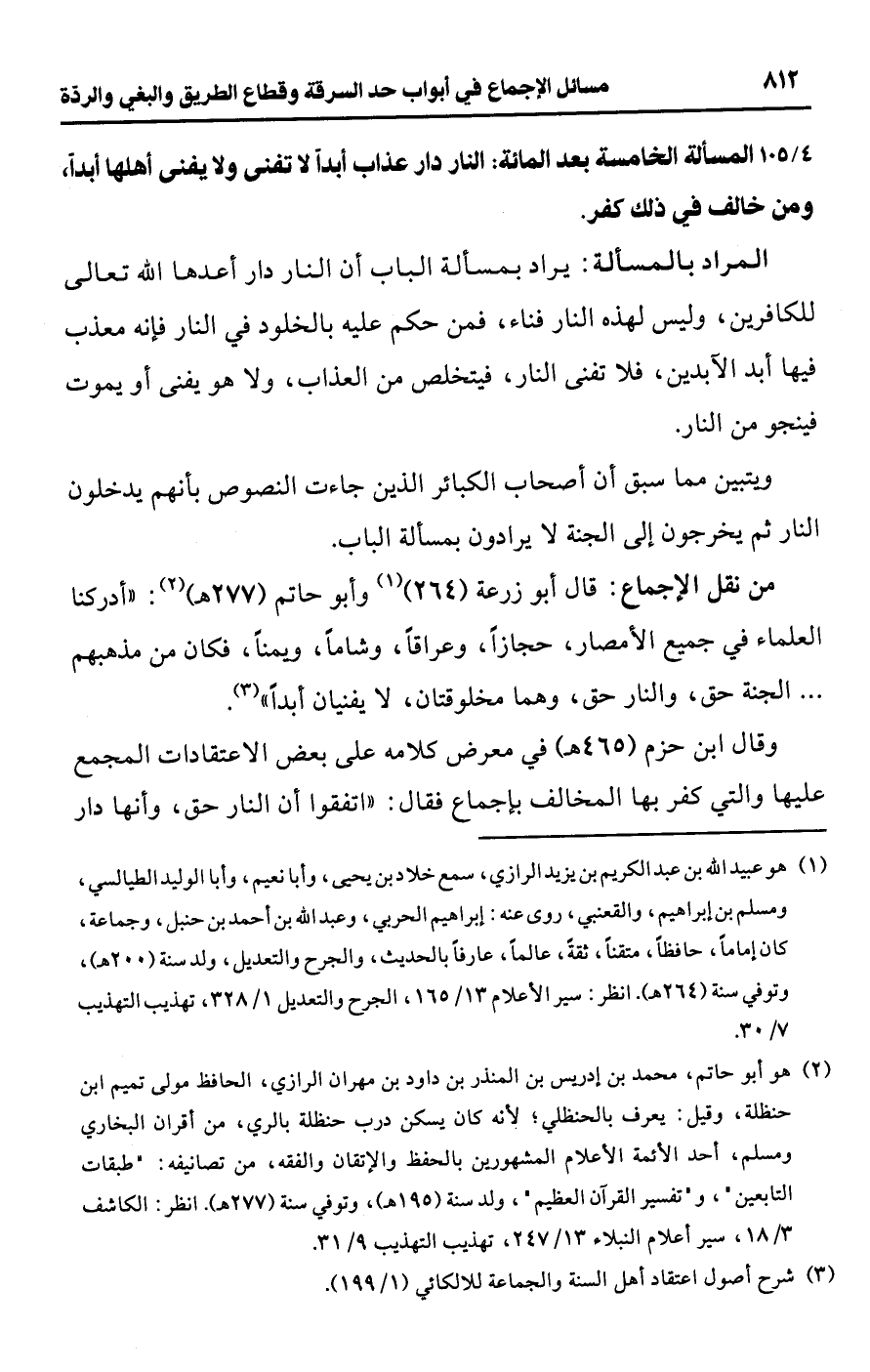 • من نقل الإجماع: قال أبو زرعة (264) (¬1) وأبو حاتم (277 هـ) (¬2): "أدركنا العلماء في جميع الأمصار، حجازًا، وعراقًا، وشامًا، ويمنًا، فكان من مذهبهم. . . الجنة حق، والنار حق، وهما مخلوقتان، لا يفنيان أبدًا" (¬3).