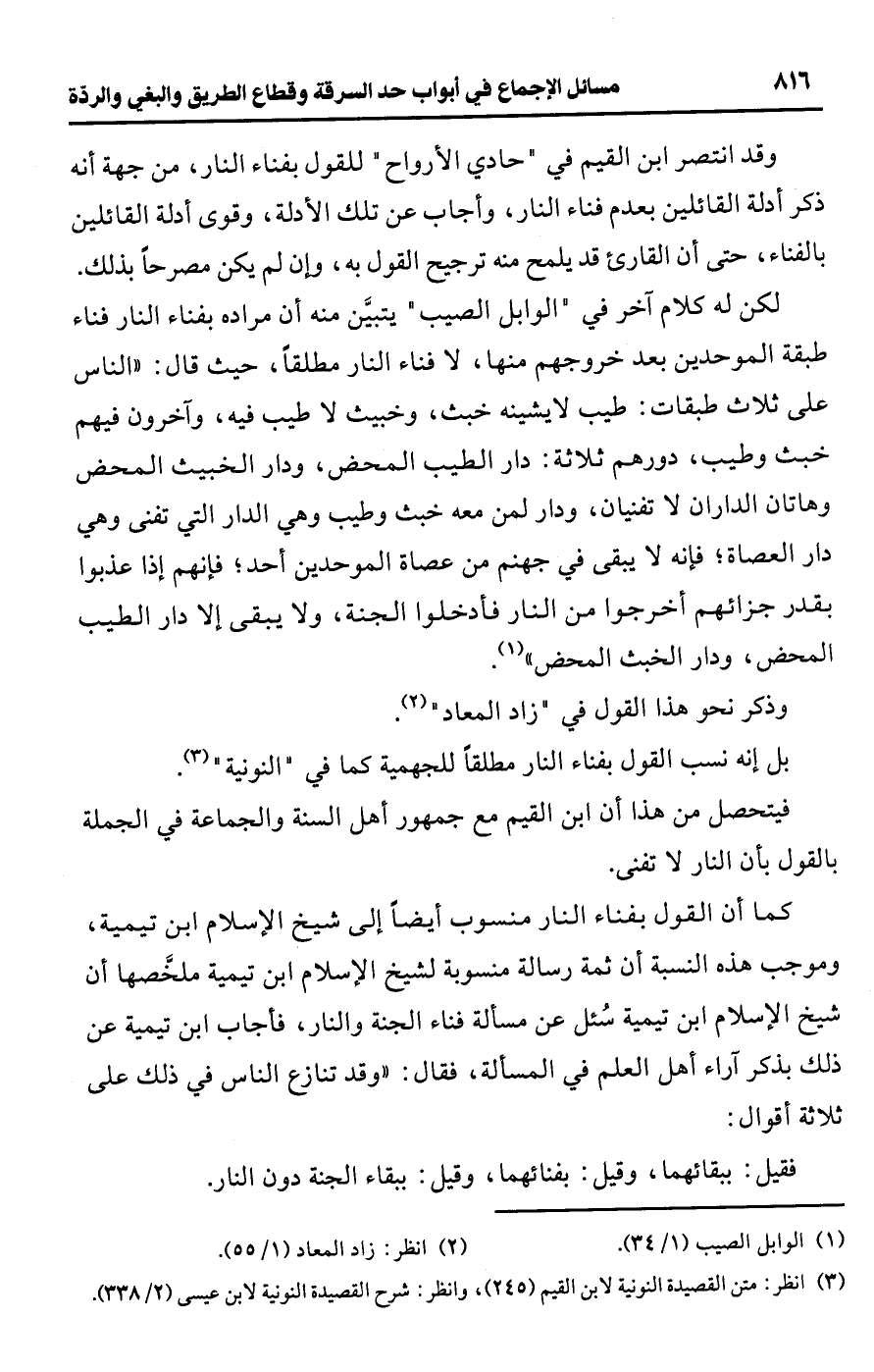 فيتحصل من هذا أن ابن القيم مع جمهور أهل السنة والجماعة في الجملة بالقول بأن النار لا تفنى.