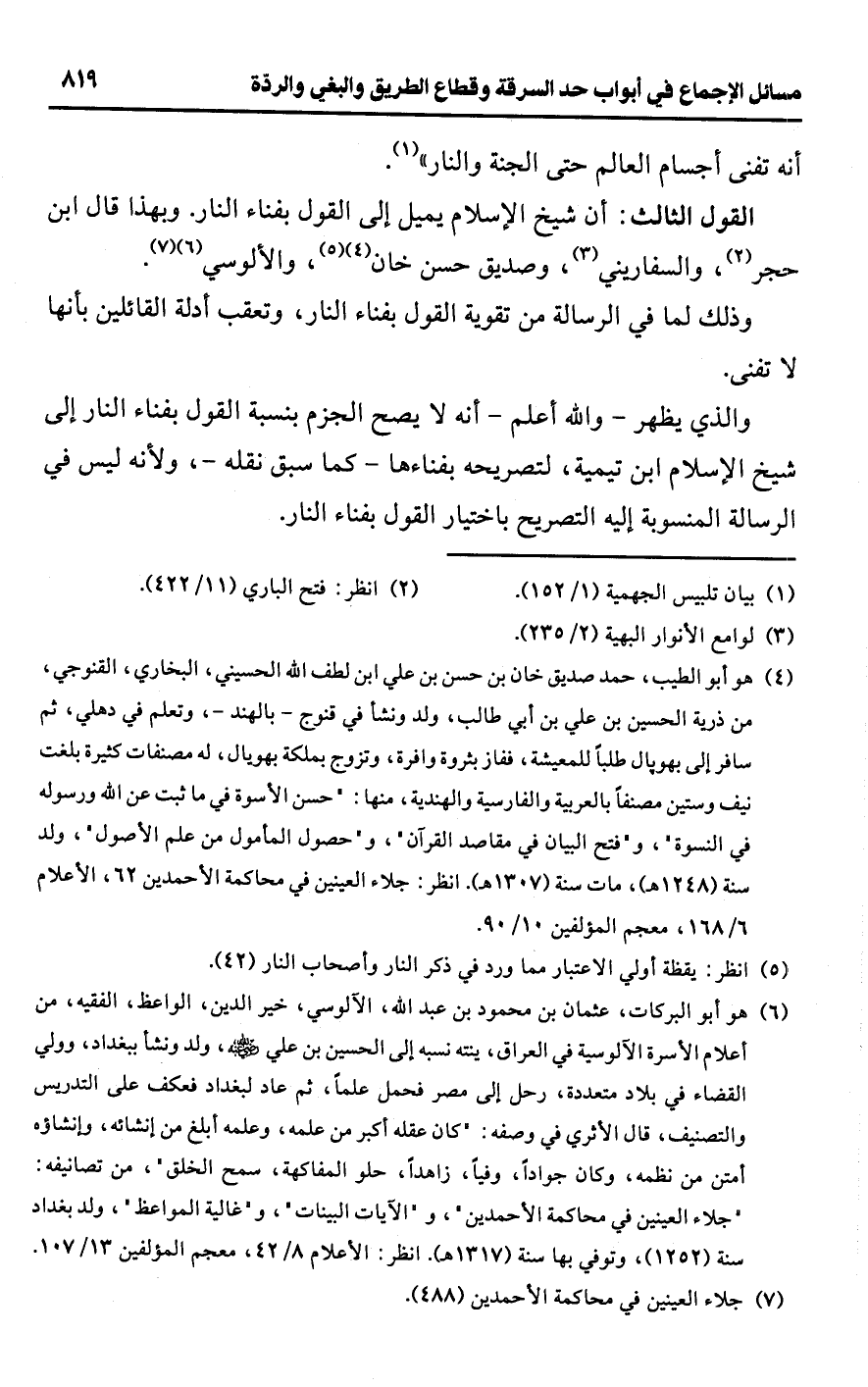 القول الثالث: أن شيخ الإسلام يميل إلى القول بفناء النار. وبهذا قال ابن حجر (¬2)، والسفاريني (¬3)، وصديق حسن خان (¬4) (¬5)، والألوسي (¬6) (¬7).