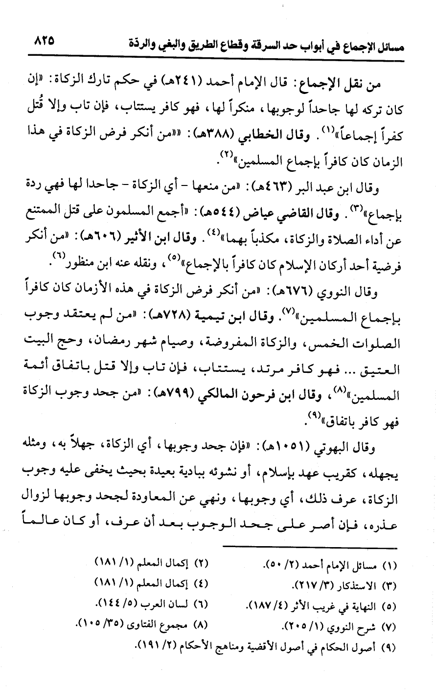 • من نقل الإجماع: قال الإمام أحمد (241 هـ) في حكم تارك الزكاة: "إن كان تركه لها جاحدًا لوجوبها، منكرًا لها، فهو كافر يستتاب، فإن تاب وإلا قُتل كفرًا إجماعًا" (¬1). وقال الخطابي (388 هـ): ""من أنكر فرض الزكاة في هذا الزمان كان كافرًا بإجماع المسلمين" (¬2).