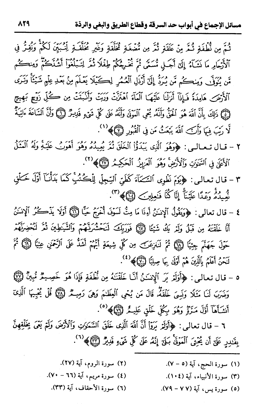 6 - قال تعالى: {أَوَلَمْ يَرَوْا أَنَّ اللَّهَ الَّذِي خَلَقَ السَّمَاوَاتِ وَالْأَرْضَ وَلَمْ يَعْيَ بِخَلْقِهِنَّ بِقَادِرٍ عَلَى أَنْ يُحْيِيَ الْمَوْتَى بَلَى إِنَّهُ عَلَى كُلِّ شَيْءٍ قَدِيرٌ (33)} (¬6).